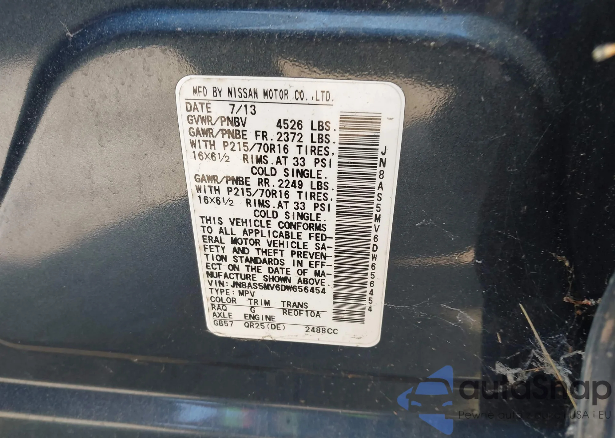 • VIN JN8AS5MV6DW656454