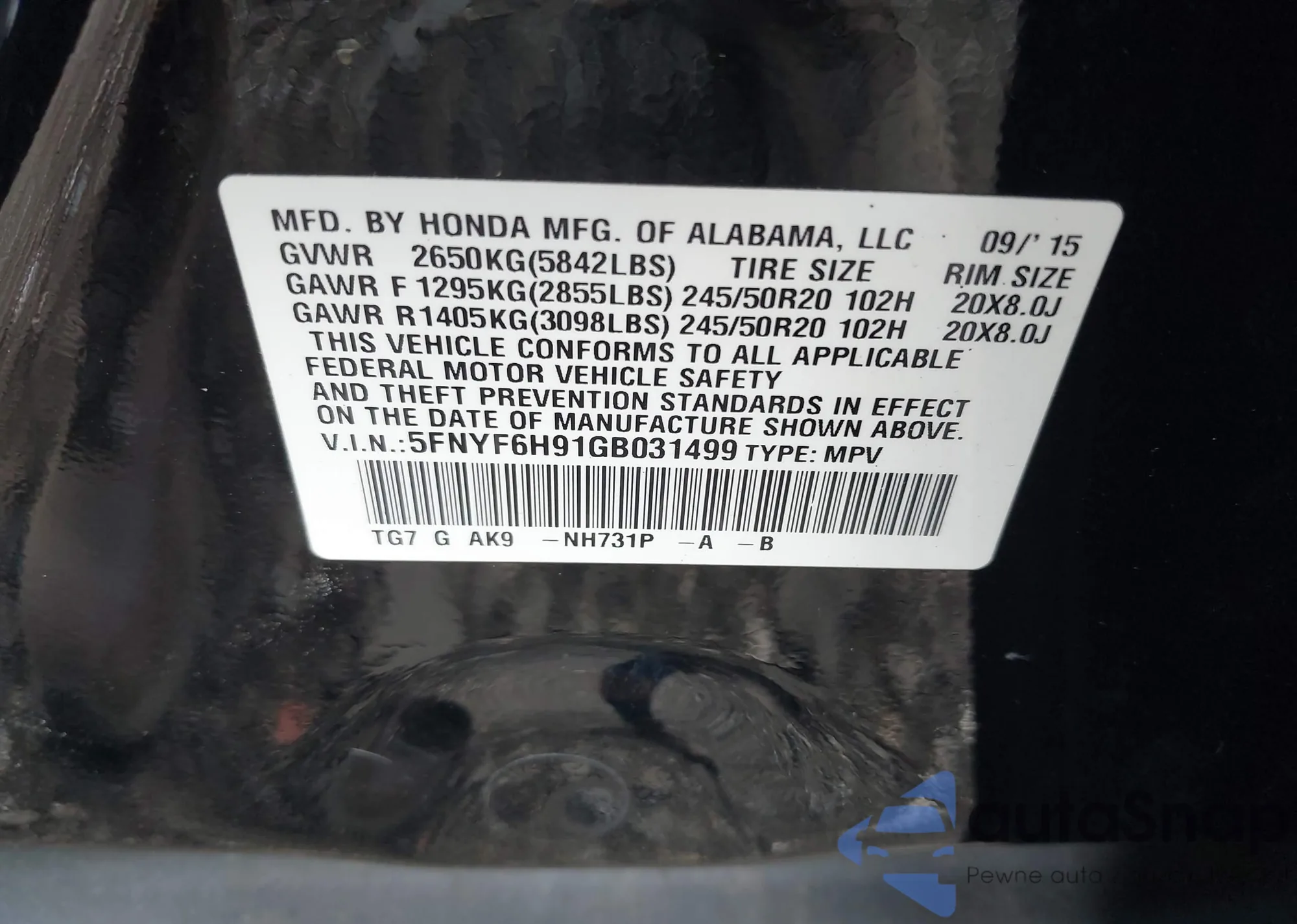 • VIN 5FNYF6H91GB031499
