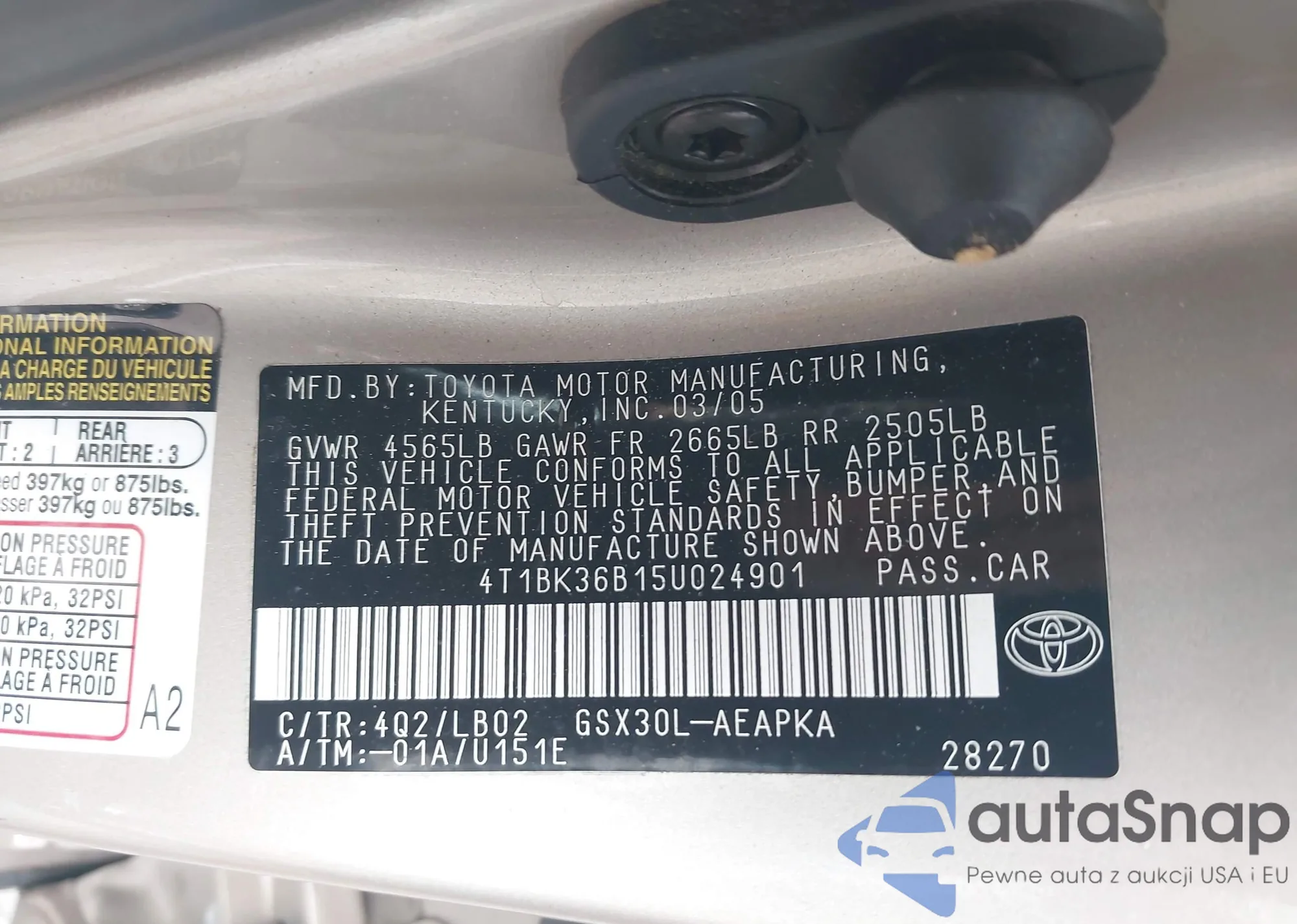 LOT: 43040997 VIN: 4T1BK36B15U024901