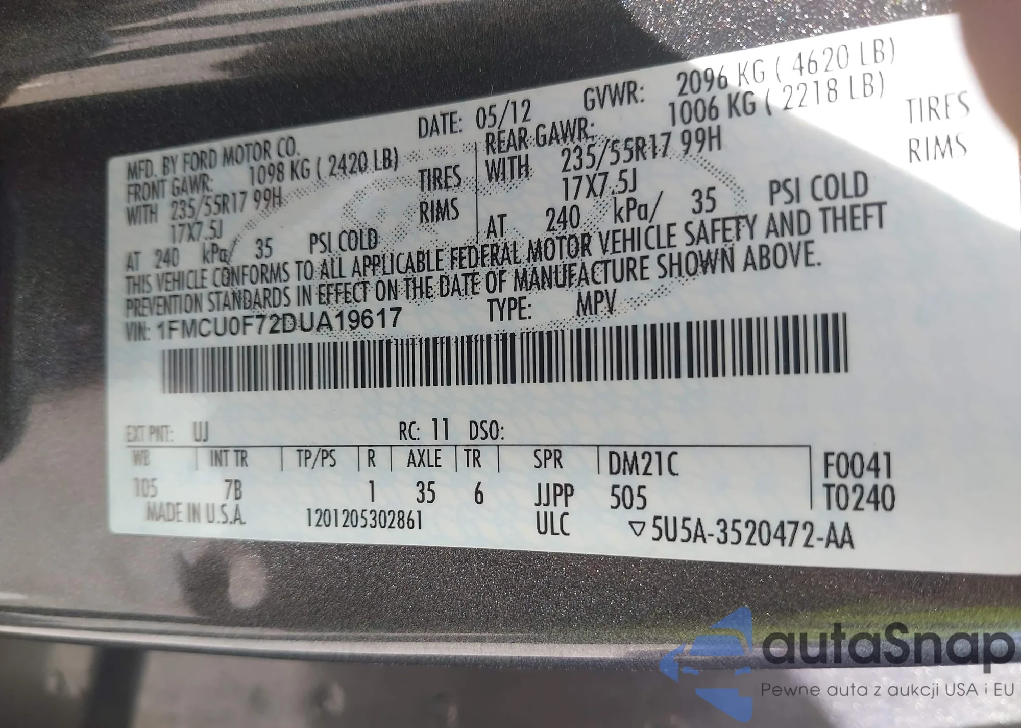 • VIN 1FMCU0F72DUA19617