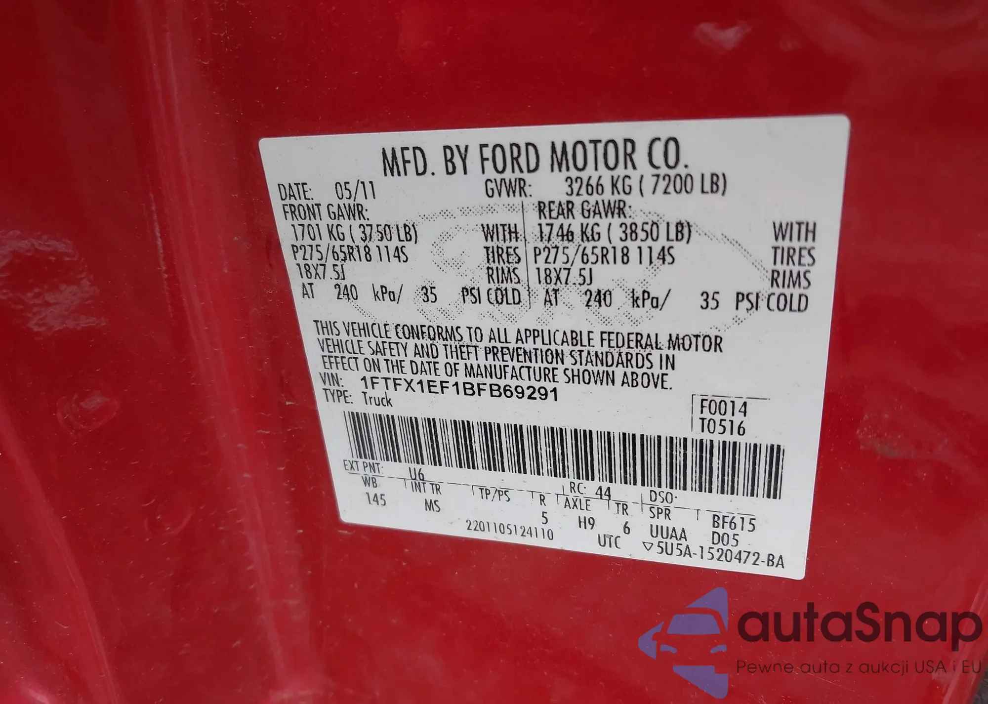 LOT: 43032438 VIN: 1FTFX1EF1BFB69291