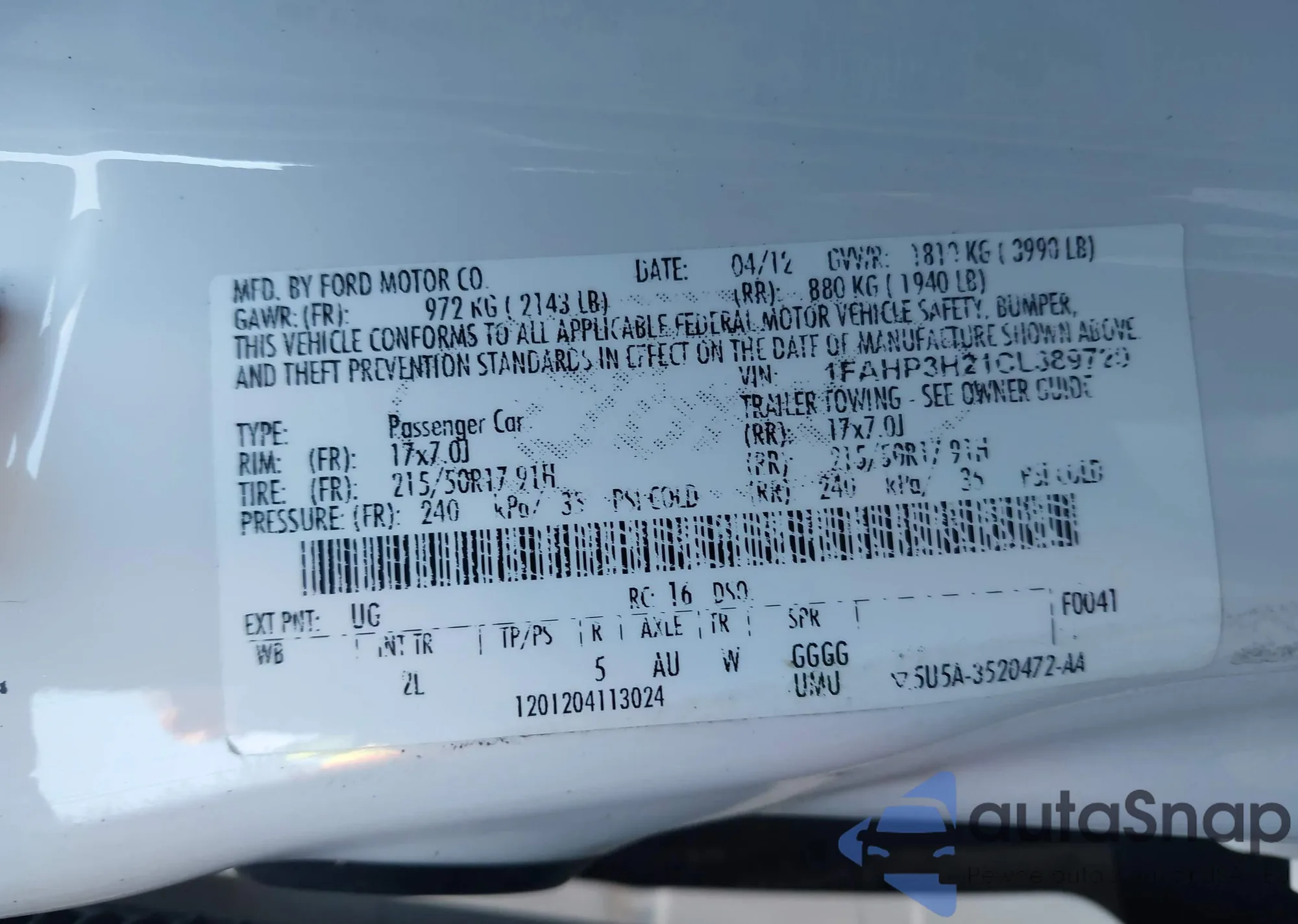 LOT: 43081284 VIN: 1FAHP3H21CL389729