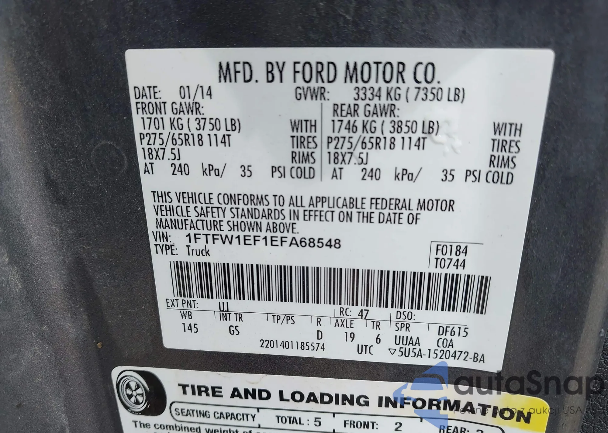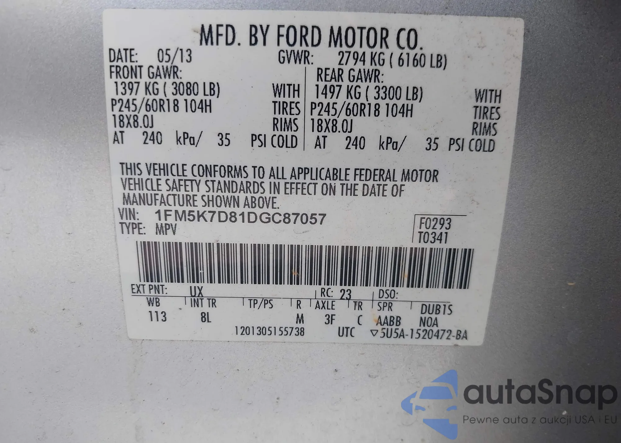 LOT: 43151356 VIN: 1FM5K7D81DGC87057
