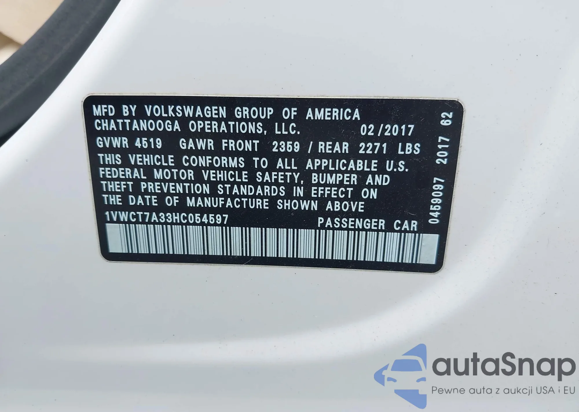 LOT: 42924909 VIN: 1VWCT7A33HC054597