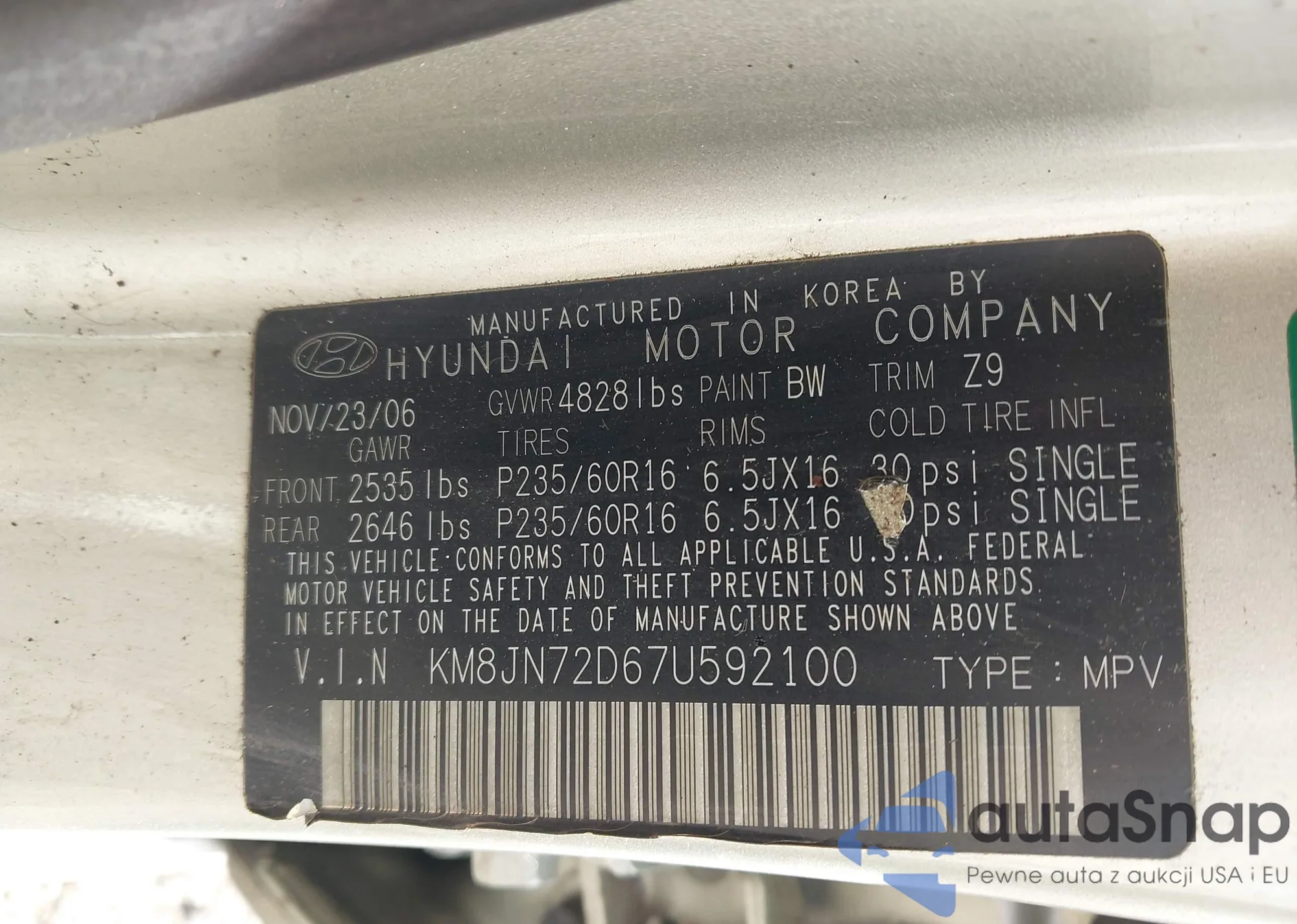 LOT: 43003527 VIN: KM8JN72D67U592100