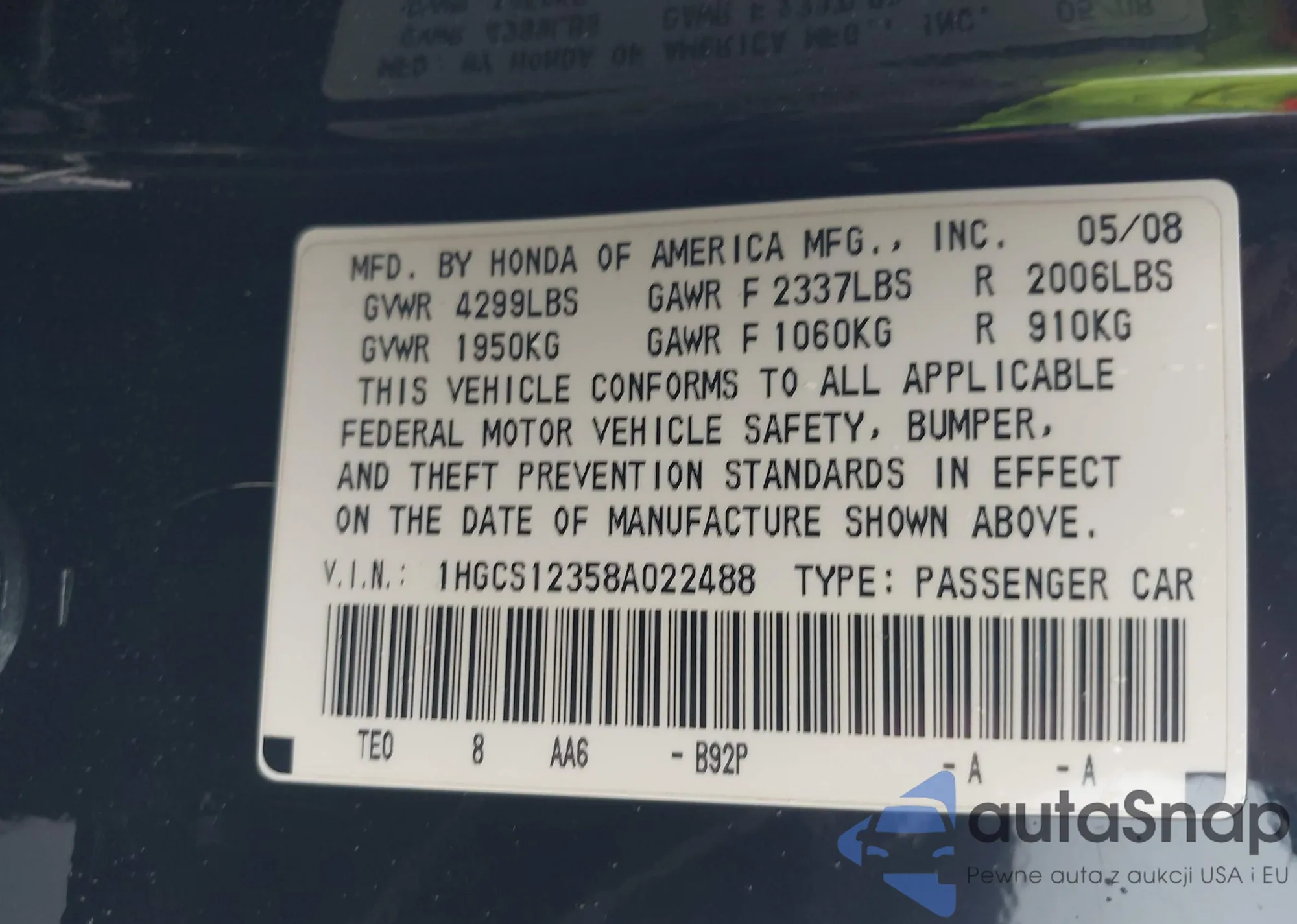 LOT: 43180552 VIN: 1HGCS12358A022488