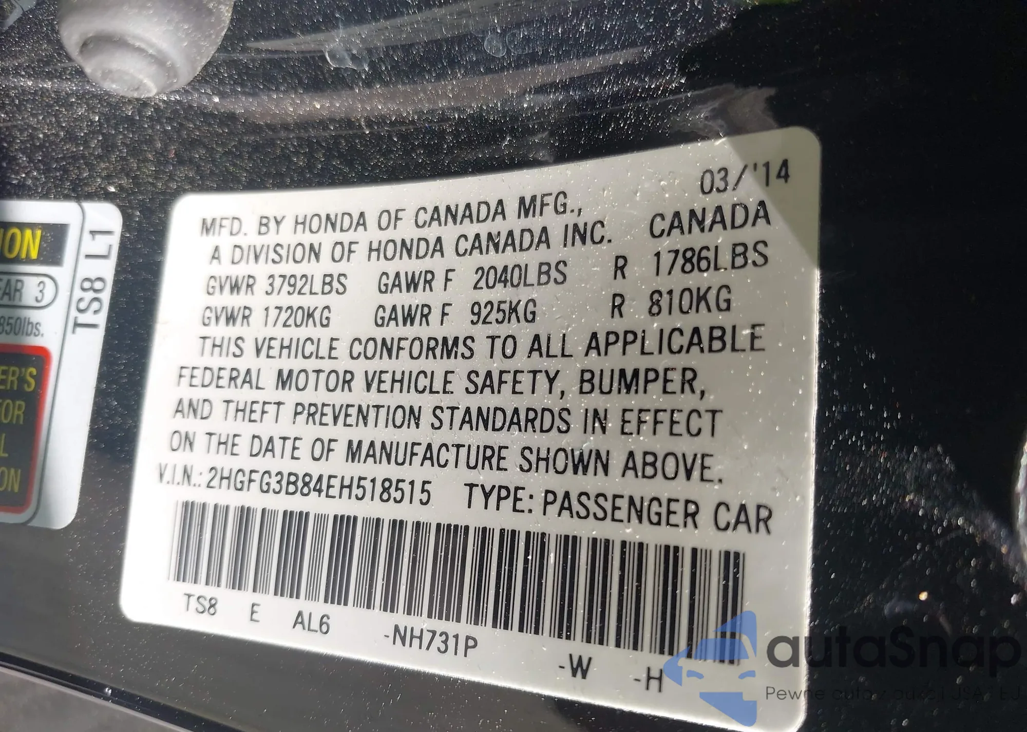 • VIN 2HGFG3B84EH518515