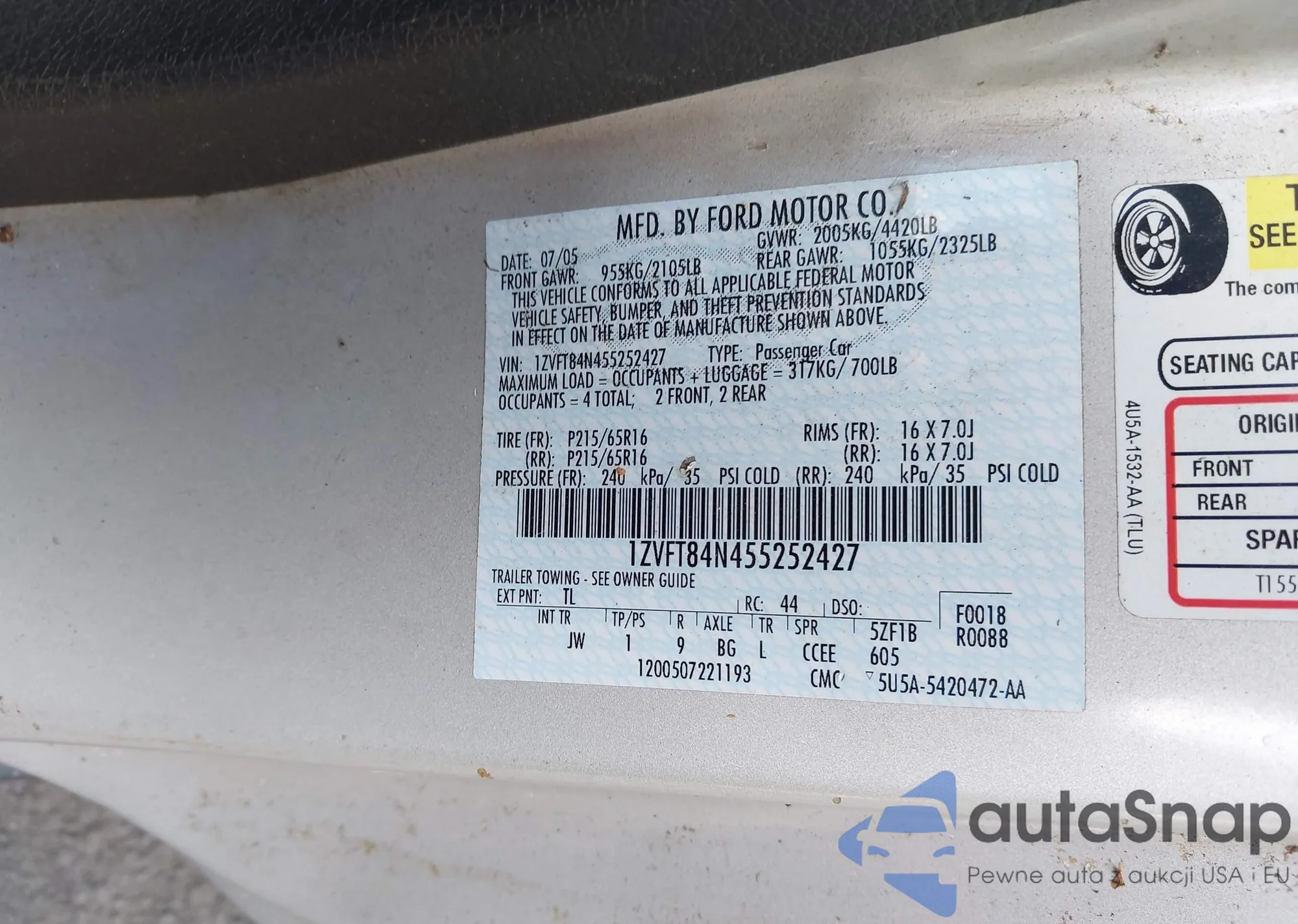 LOT: 43165838 VIN: 1HGFA16577L102356
