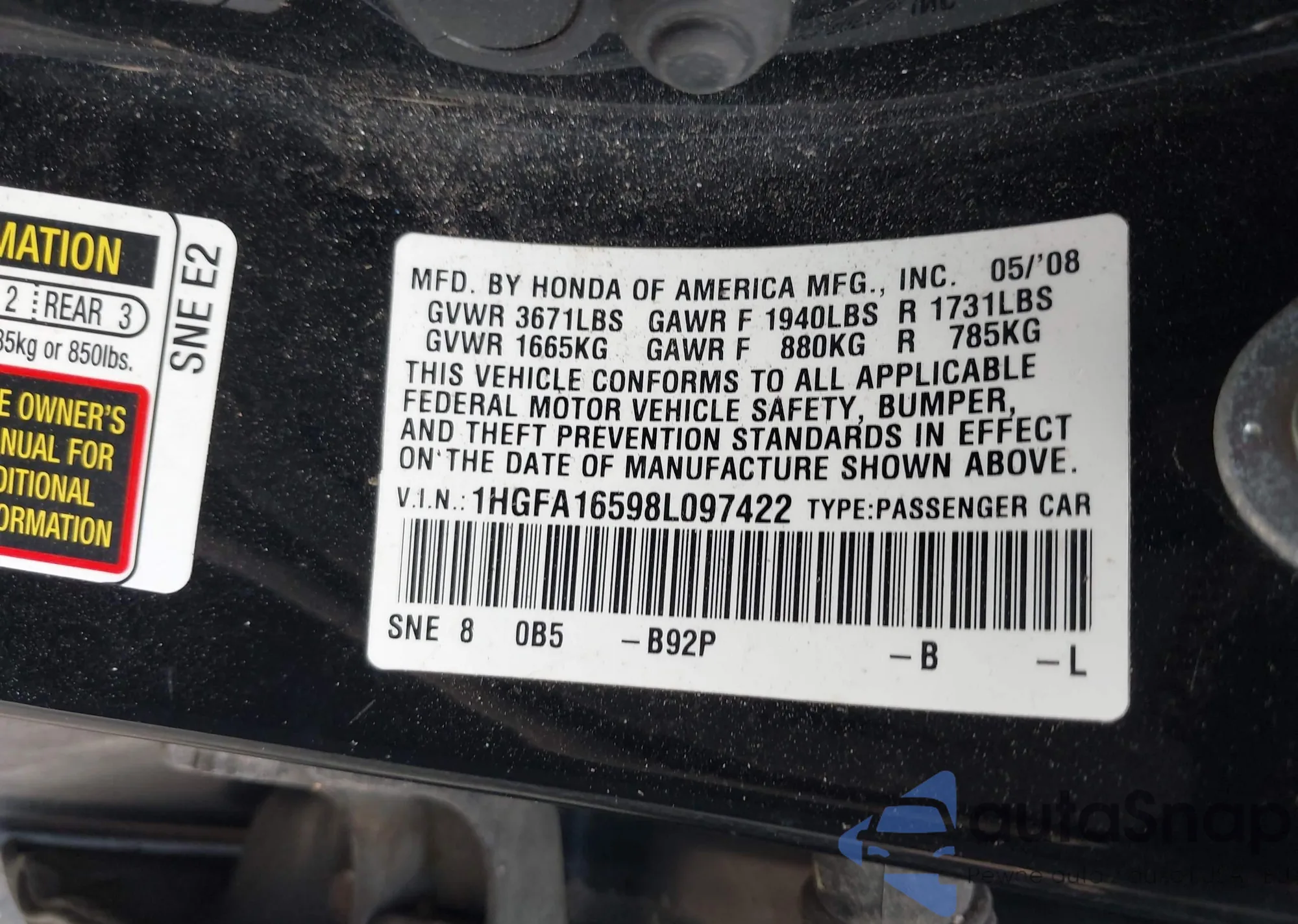 LOT: 42846893 VIN: 1HGFA16598L097422