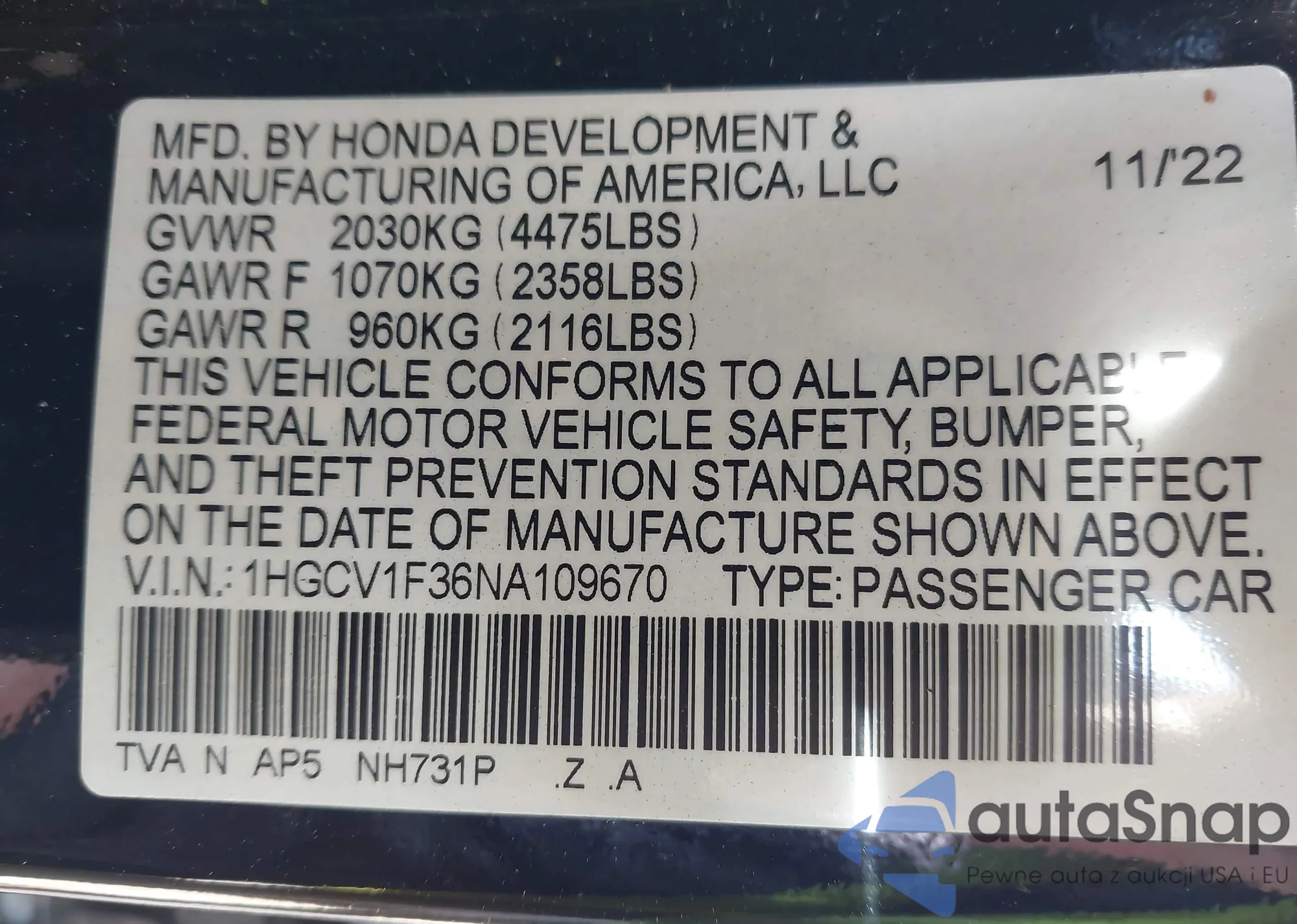 • VIN 1HGCV1F36NA109670