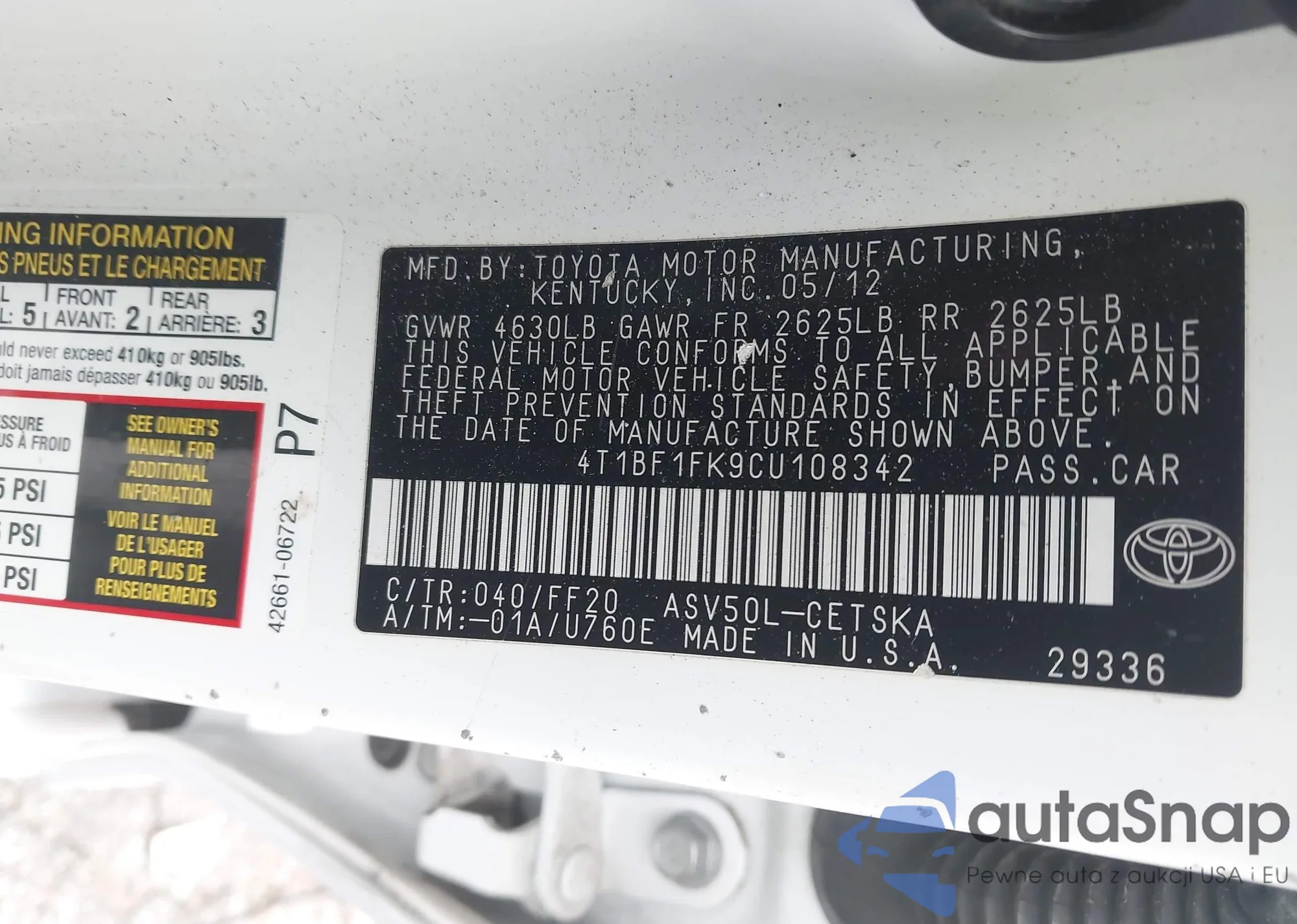 • VIN 4T1BF1FK9CU108342