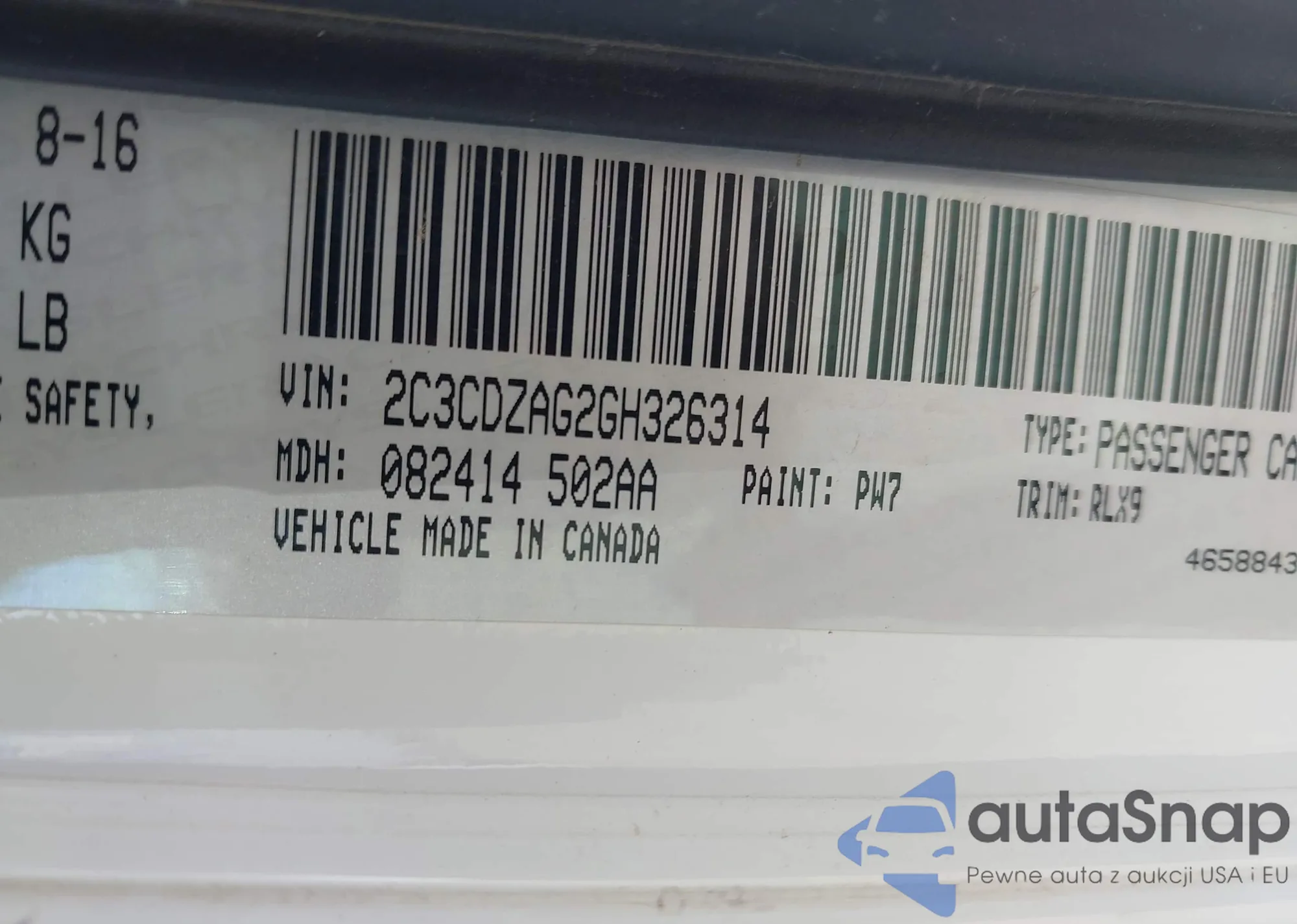 LOT: 42877244 VIN: 2C3CDZAG2GH326314