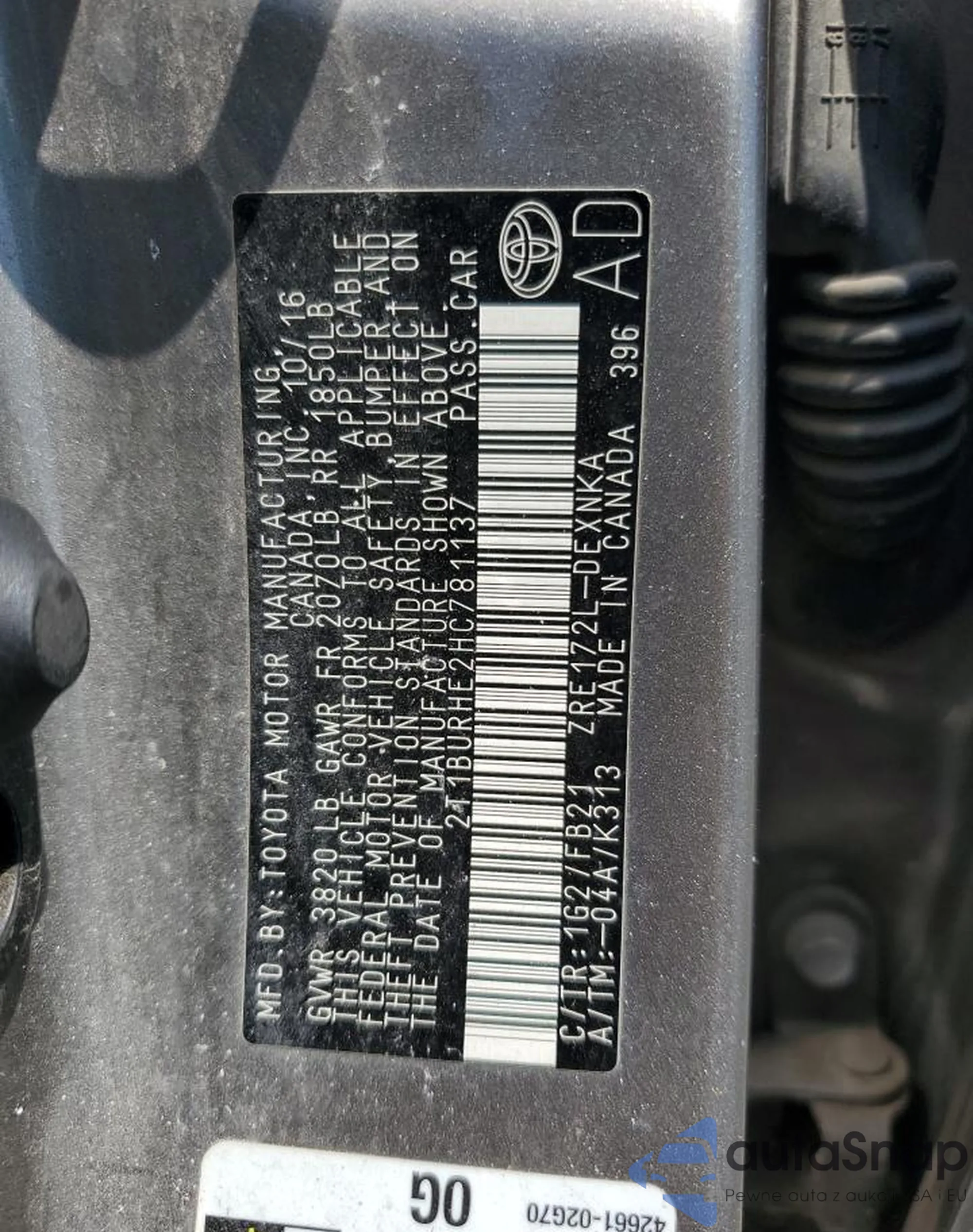 LOT: 65017955 VIN: 2T1BURHE2HC781137