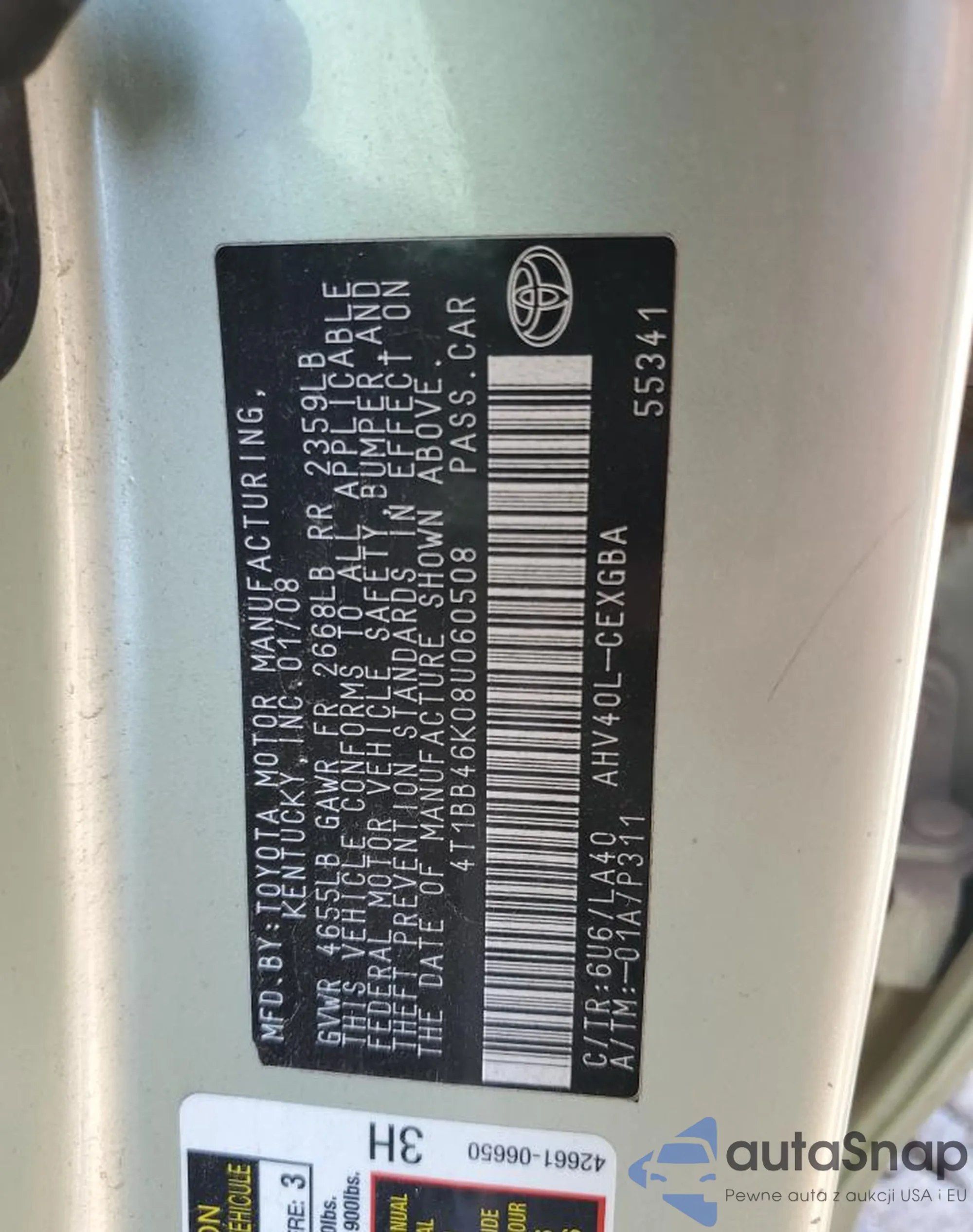 LOT: 66568695 VIN: 4T1BB46K08U060508