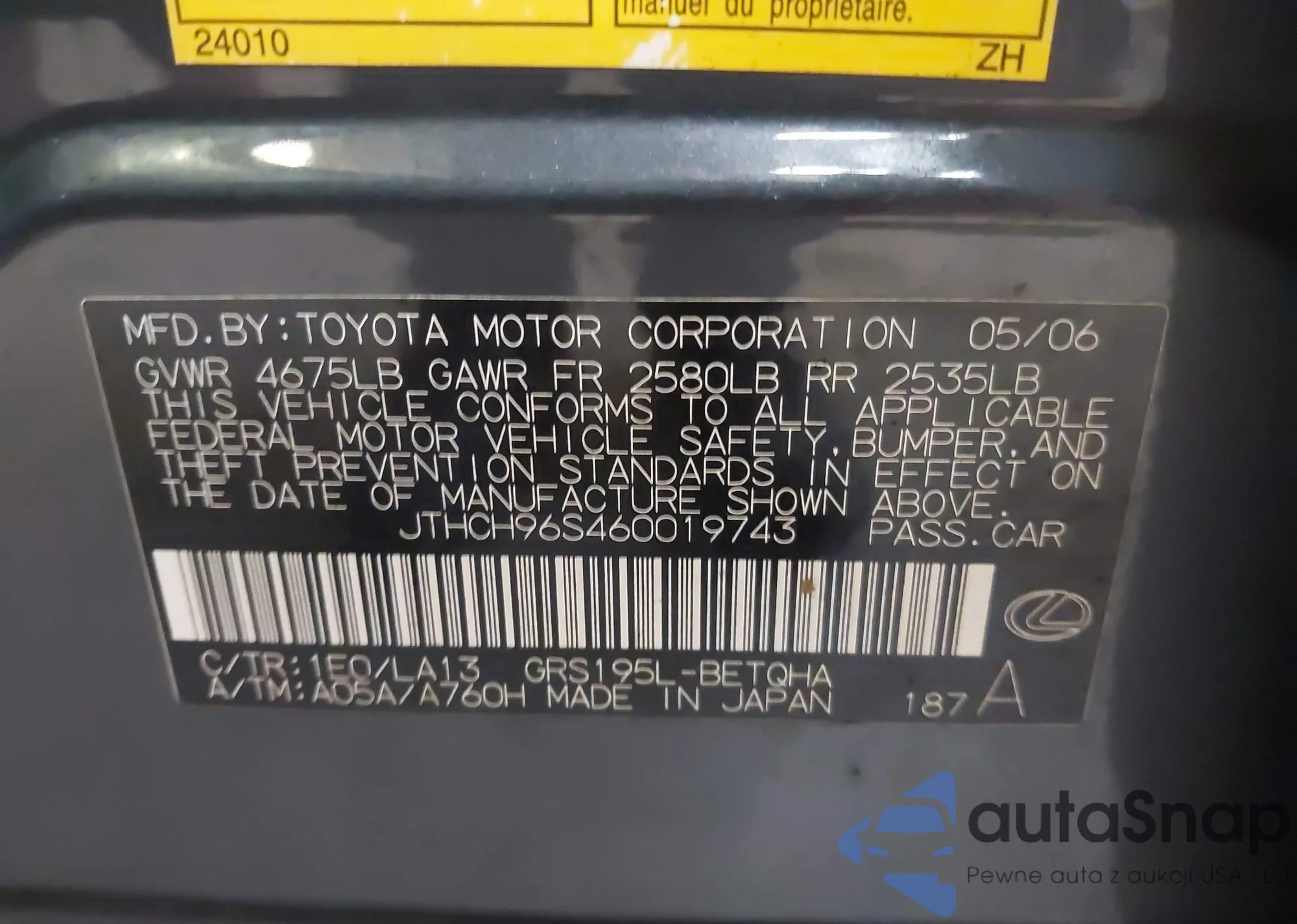 LOT: 43052208 VIN: JHMGD38637S054953