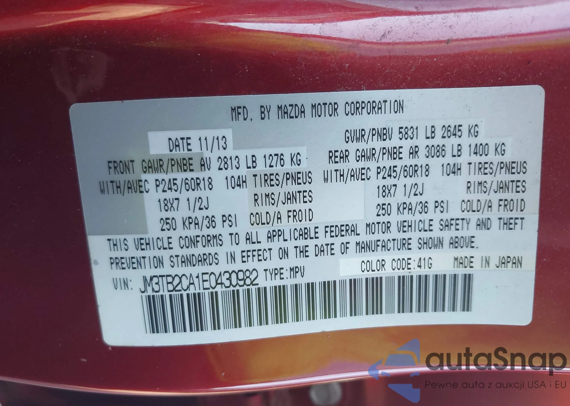 LOT: 43217268 VIN: JM3TB2CA1E0430982