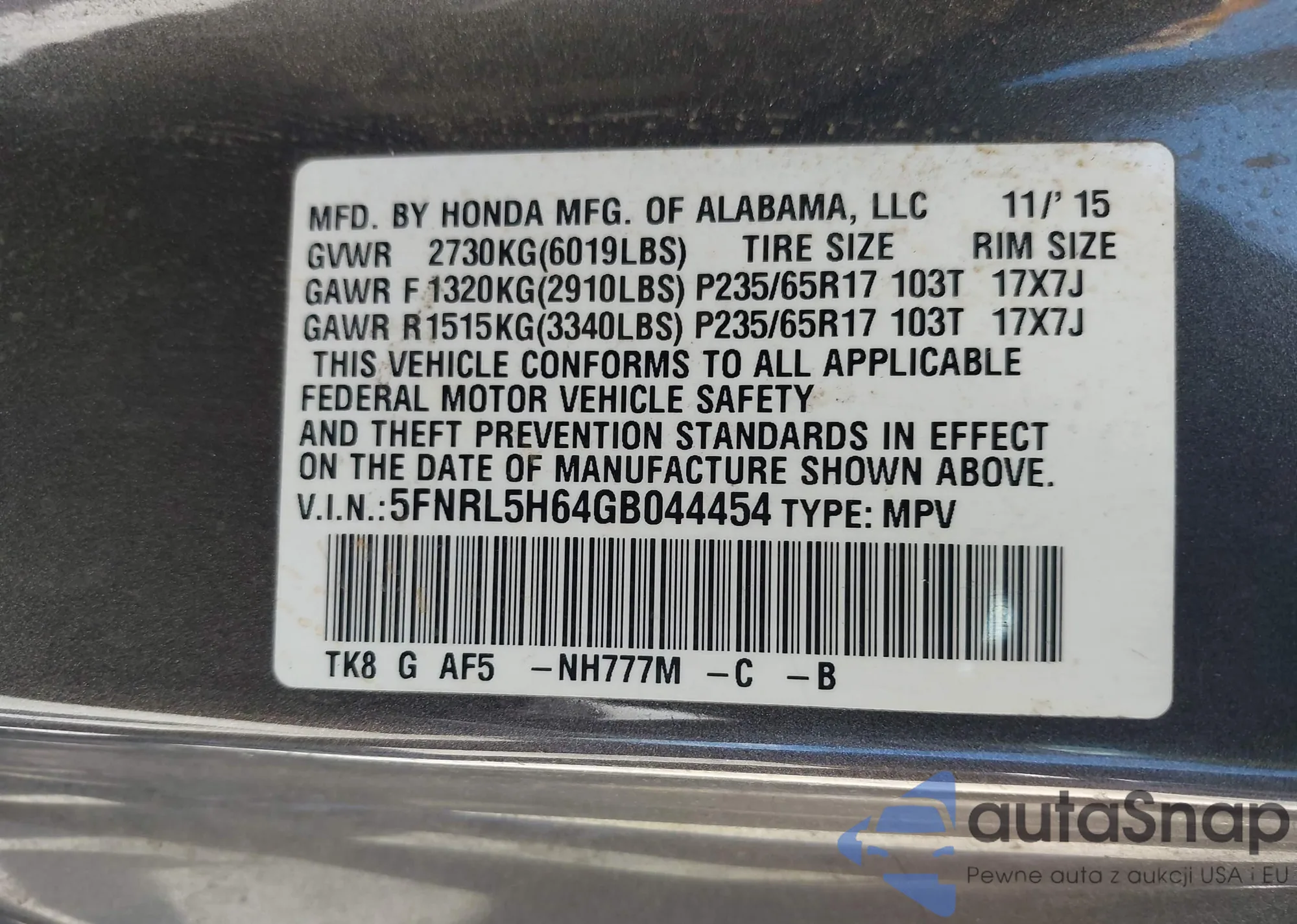 • VIN 5FNRL5H64GB044454