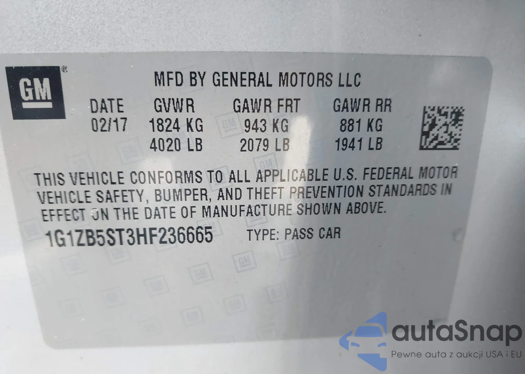 LOT: 42964434 VIN: 1G1ZB5ST3HF236665