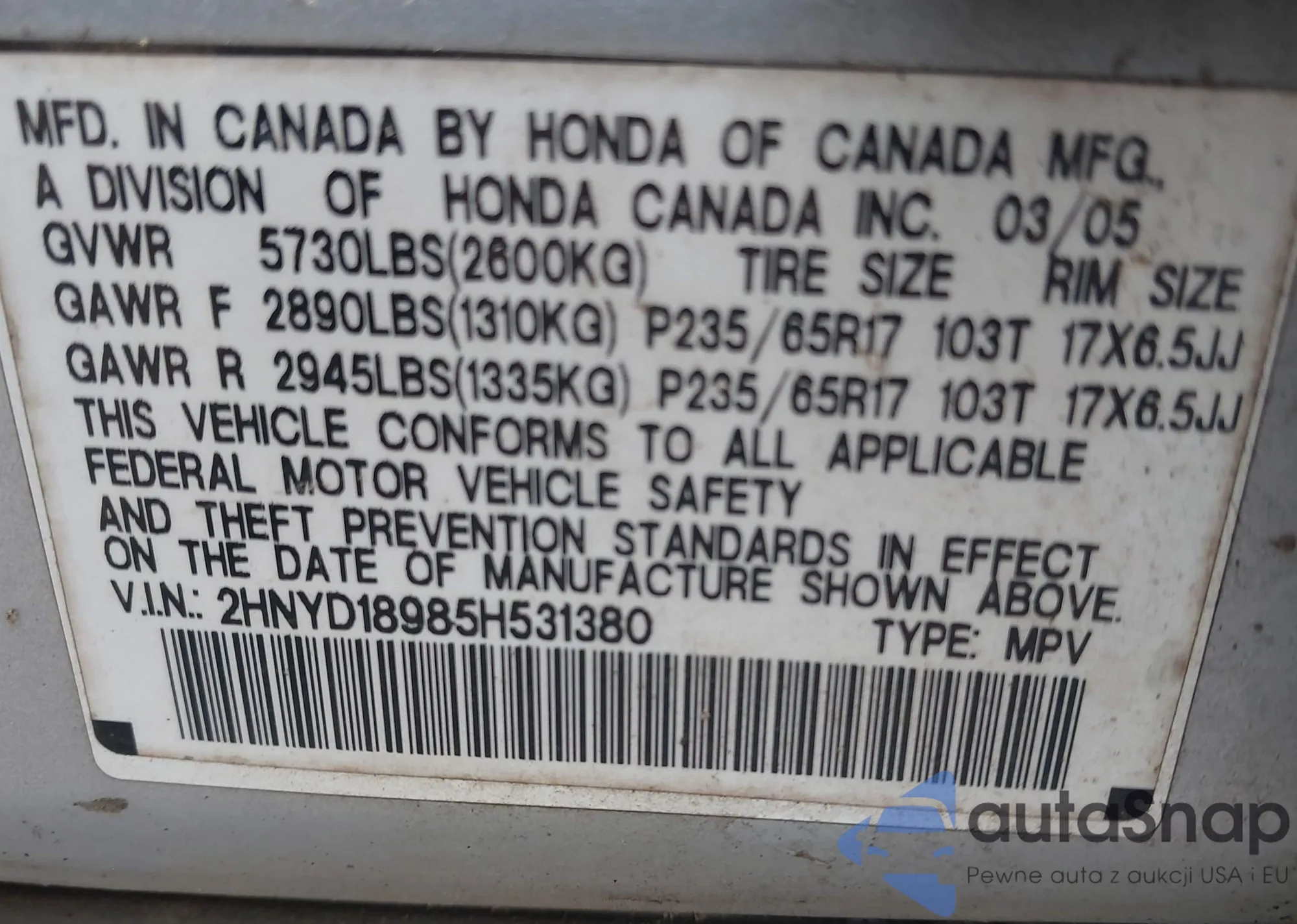 • VIN 5FRYD4H63GB028487