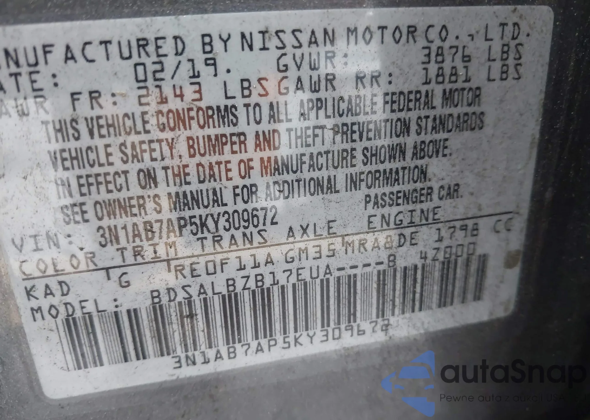 • VIN 3N1AB7AP5KY309672