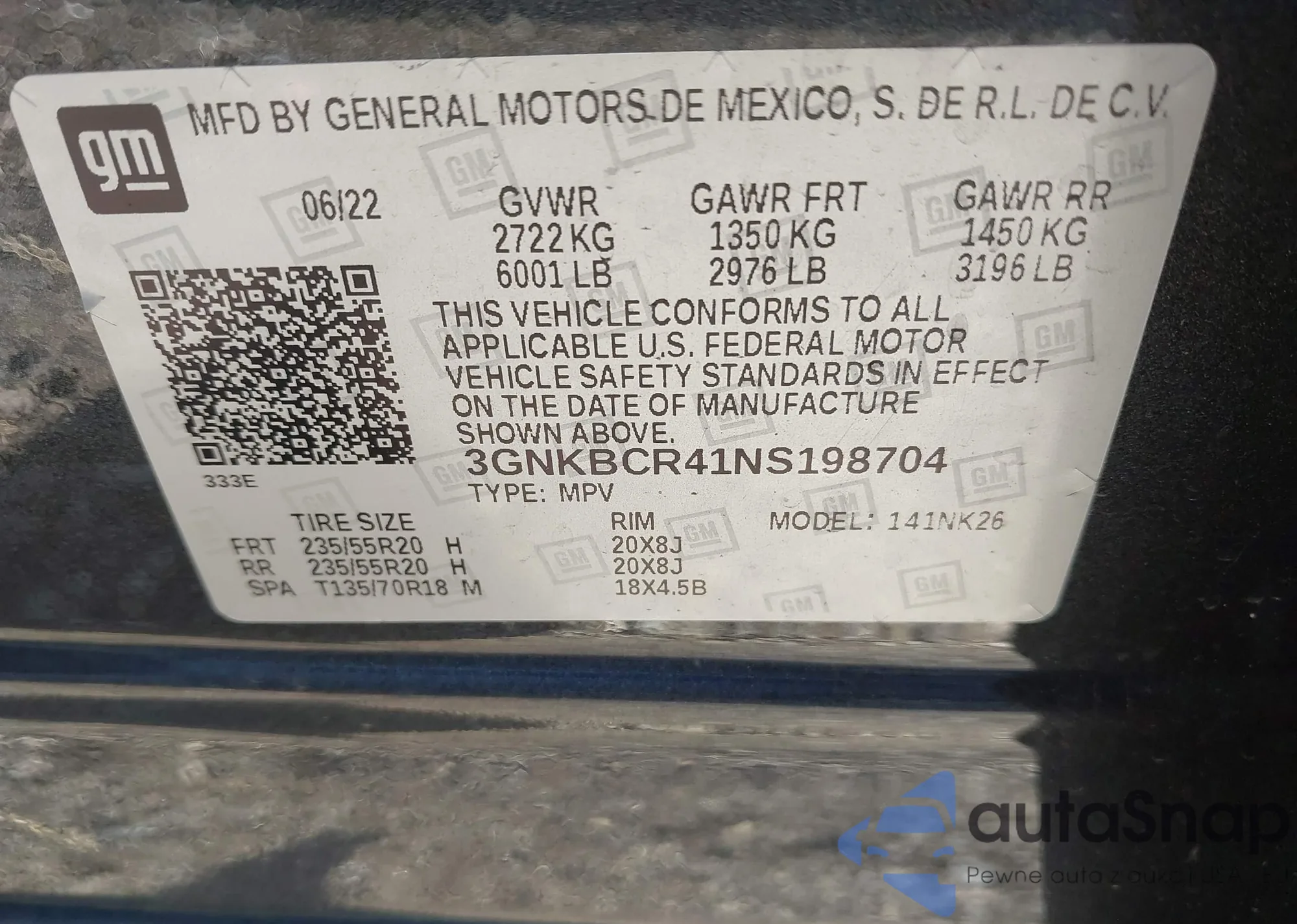 • VIN 3GNKBCR41NS198704