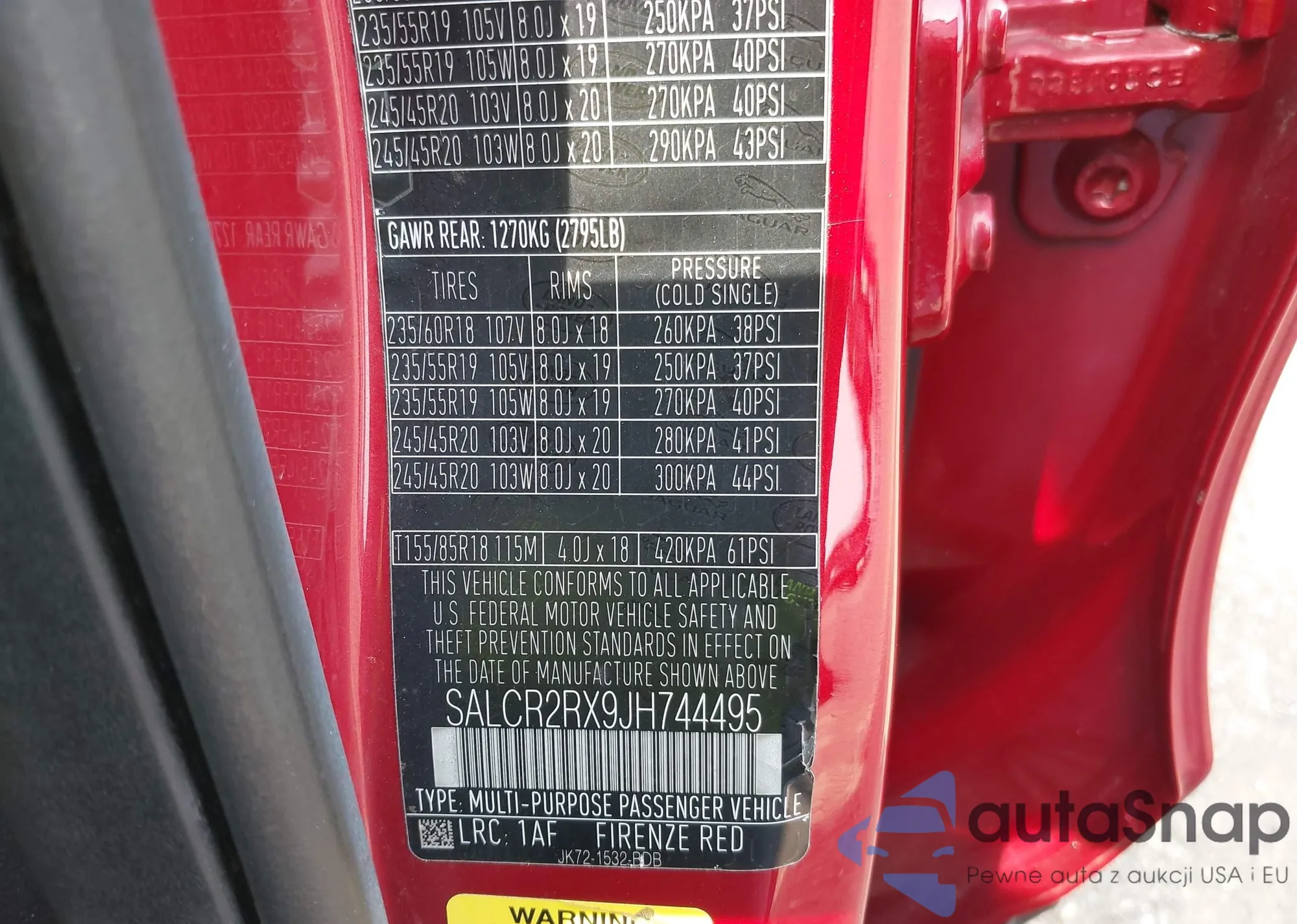 LOT: 42913421 VIN: SALCR2RX9JH744495