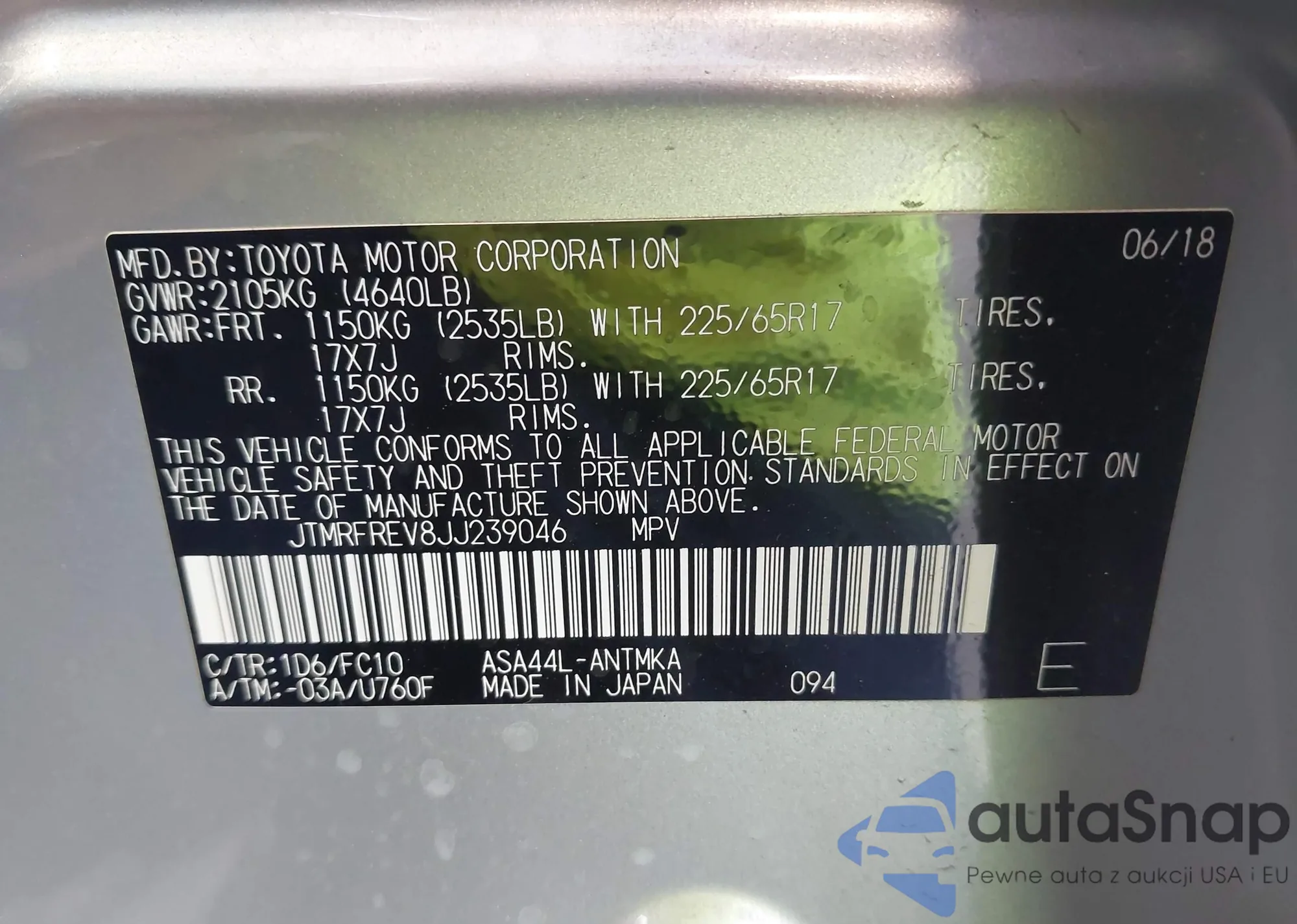LOT: 42939142 VIN: JTMRFREV8JJ239046