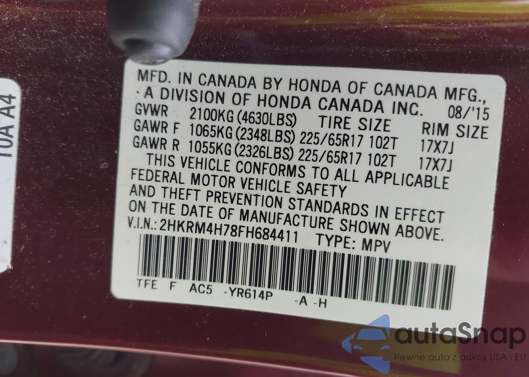 LOT: 43106358 VIN: 2HKRM4H78FH684411