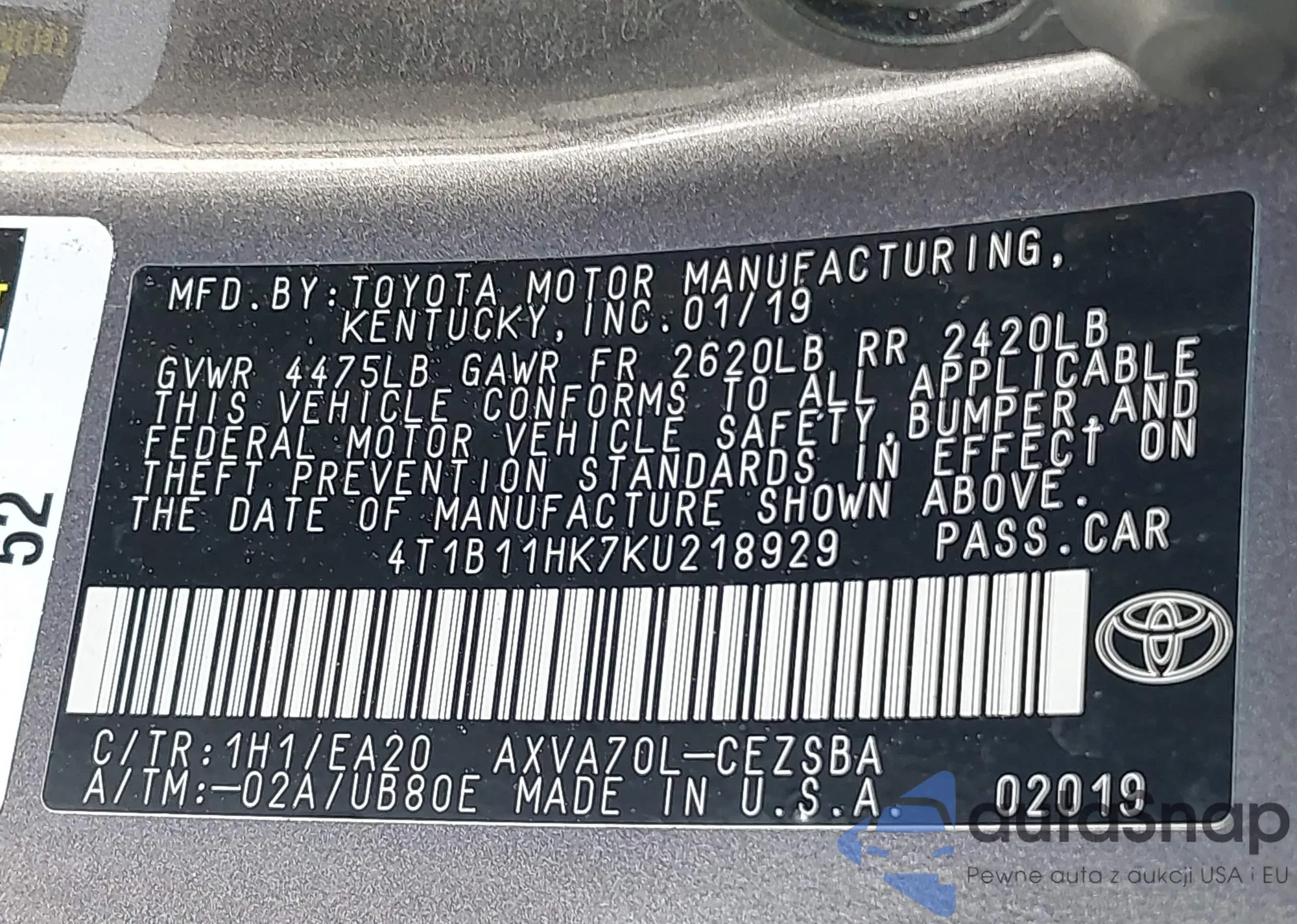 • VIN 4T1B11HK7KU218929