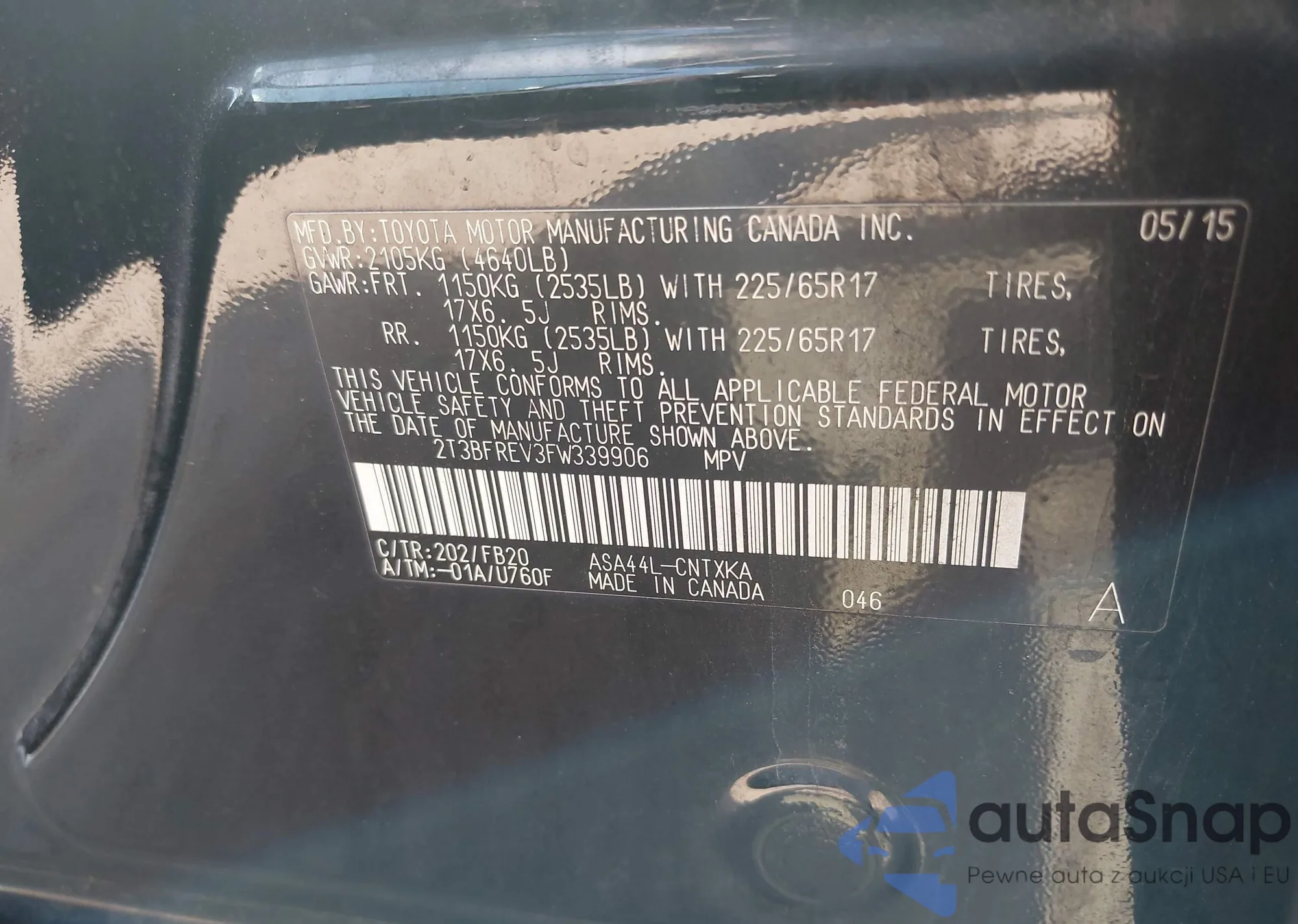 LOT: 42926806 VIN: 2T3BFREV3FW339906