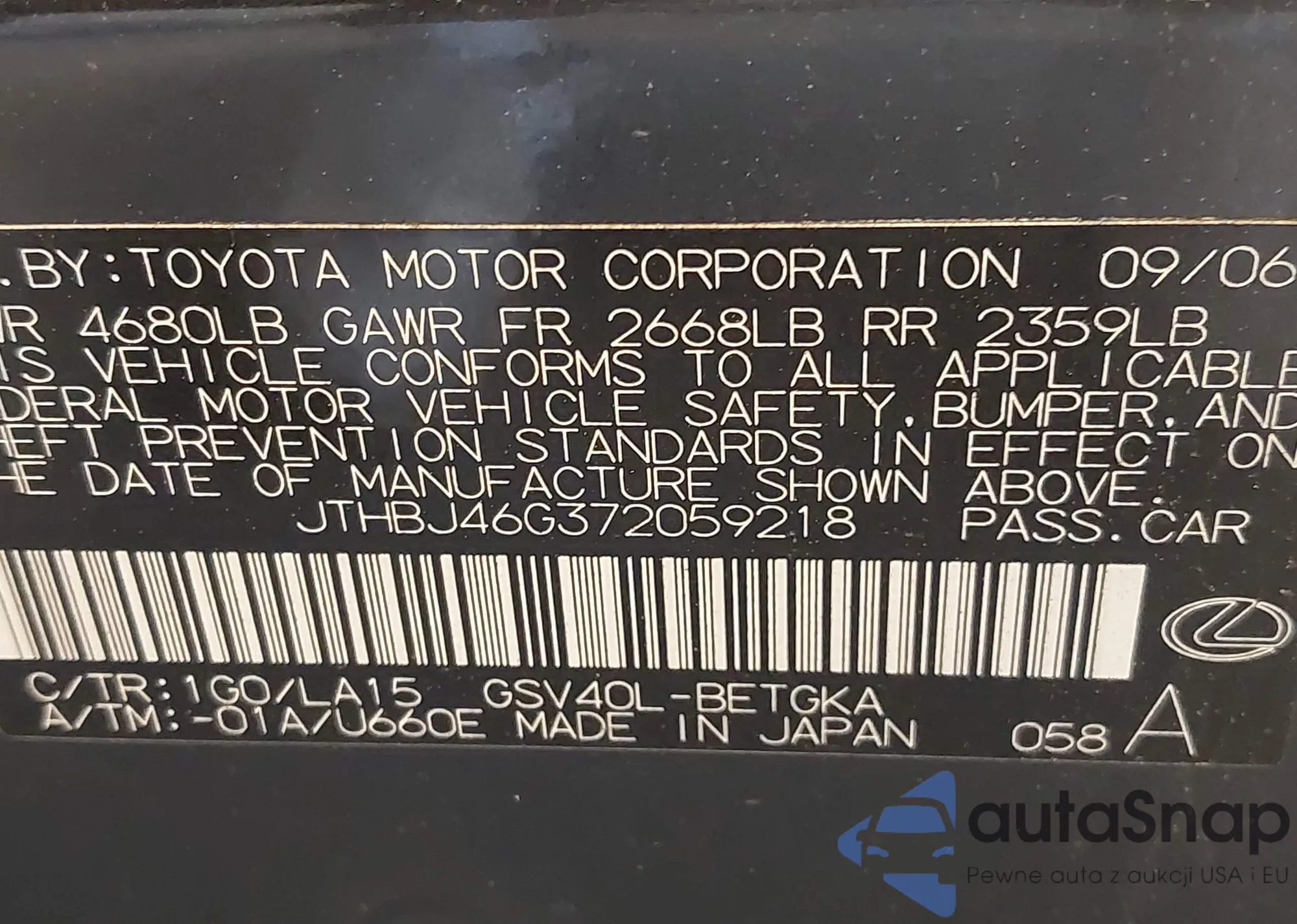 LOT: 42354525 VIN: JTHBJ46G372059218