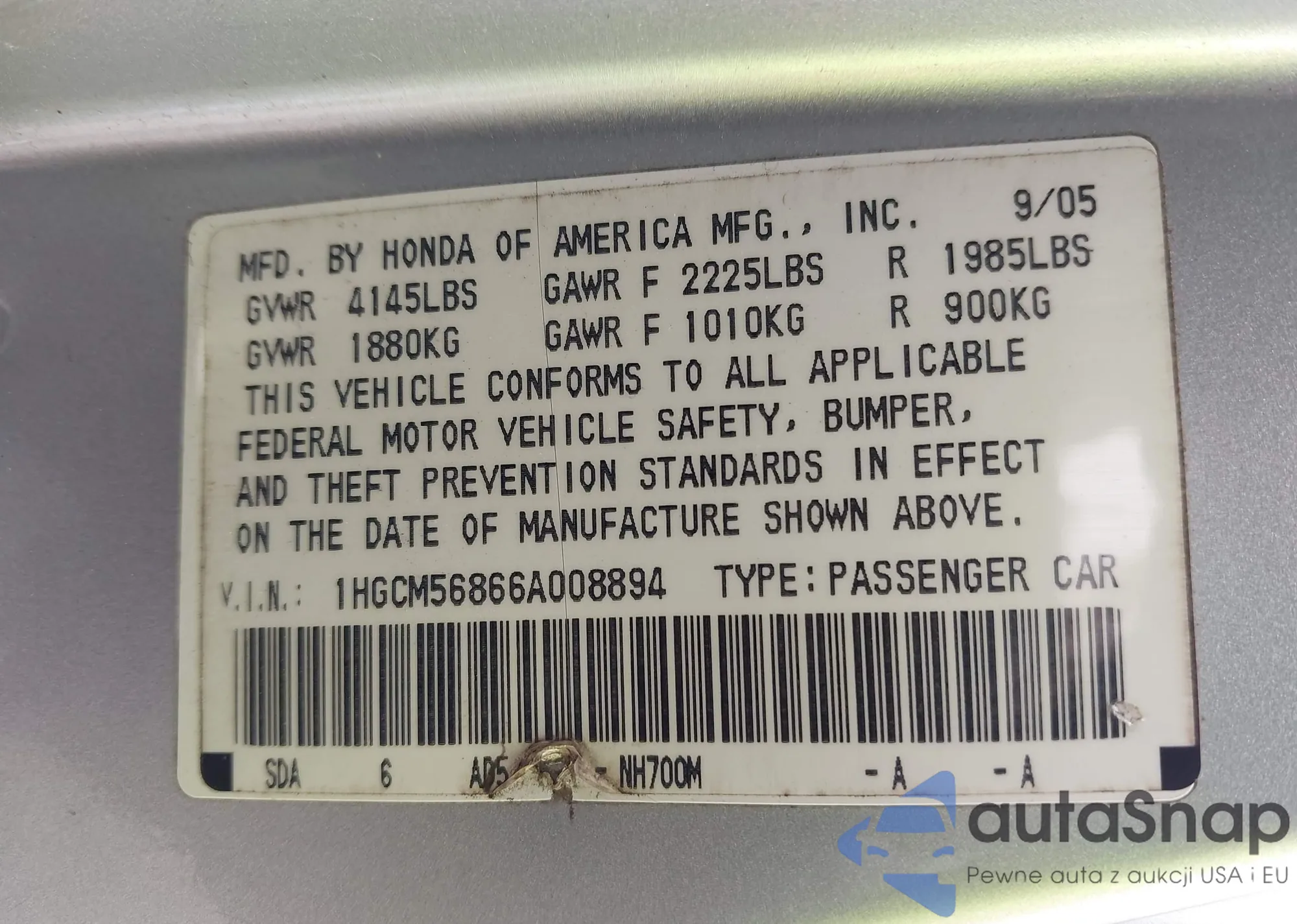 LOT: 42958810 VIN: 1HGCM56866A008894