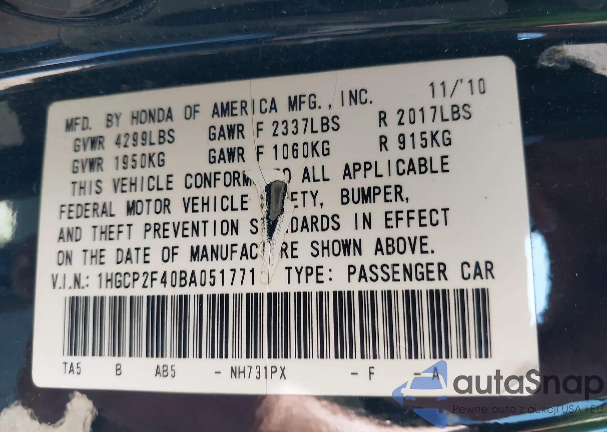 LOT: 43104695 VIN: 1HGCP2F40BA051771
