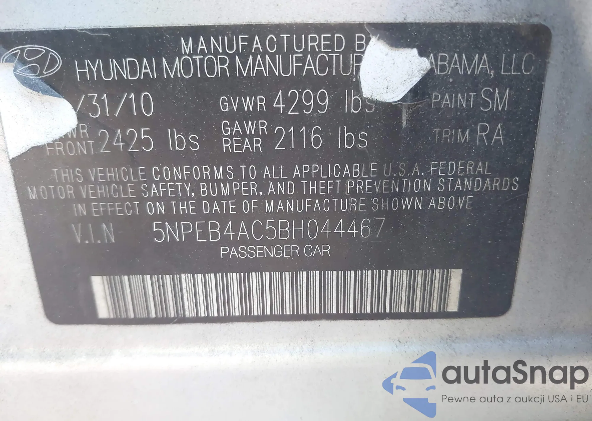 • VIN 5NPEB4AC5BH044467
