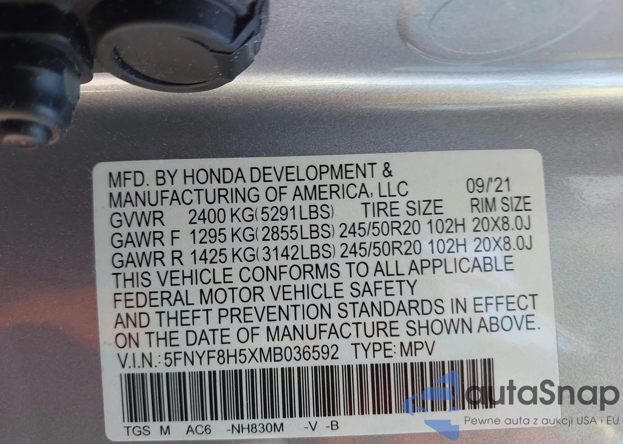 LOT: 43155401 VIN: 5FNYF8H5XMB036592