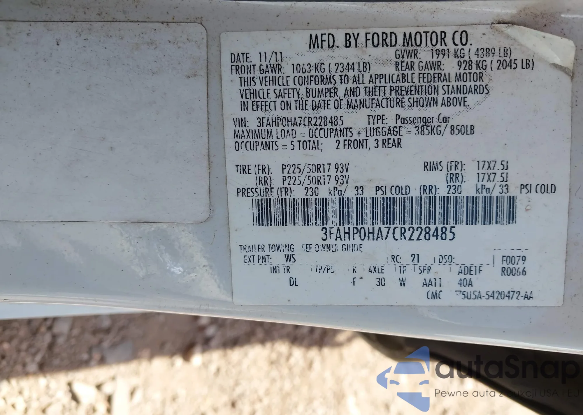 • VIN 3FAHP0HA7CR228485