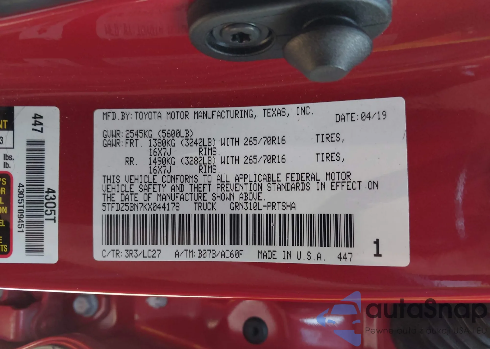• VIN 5TFDZ5BN7KX044178