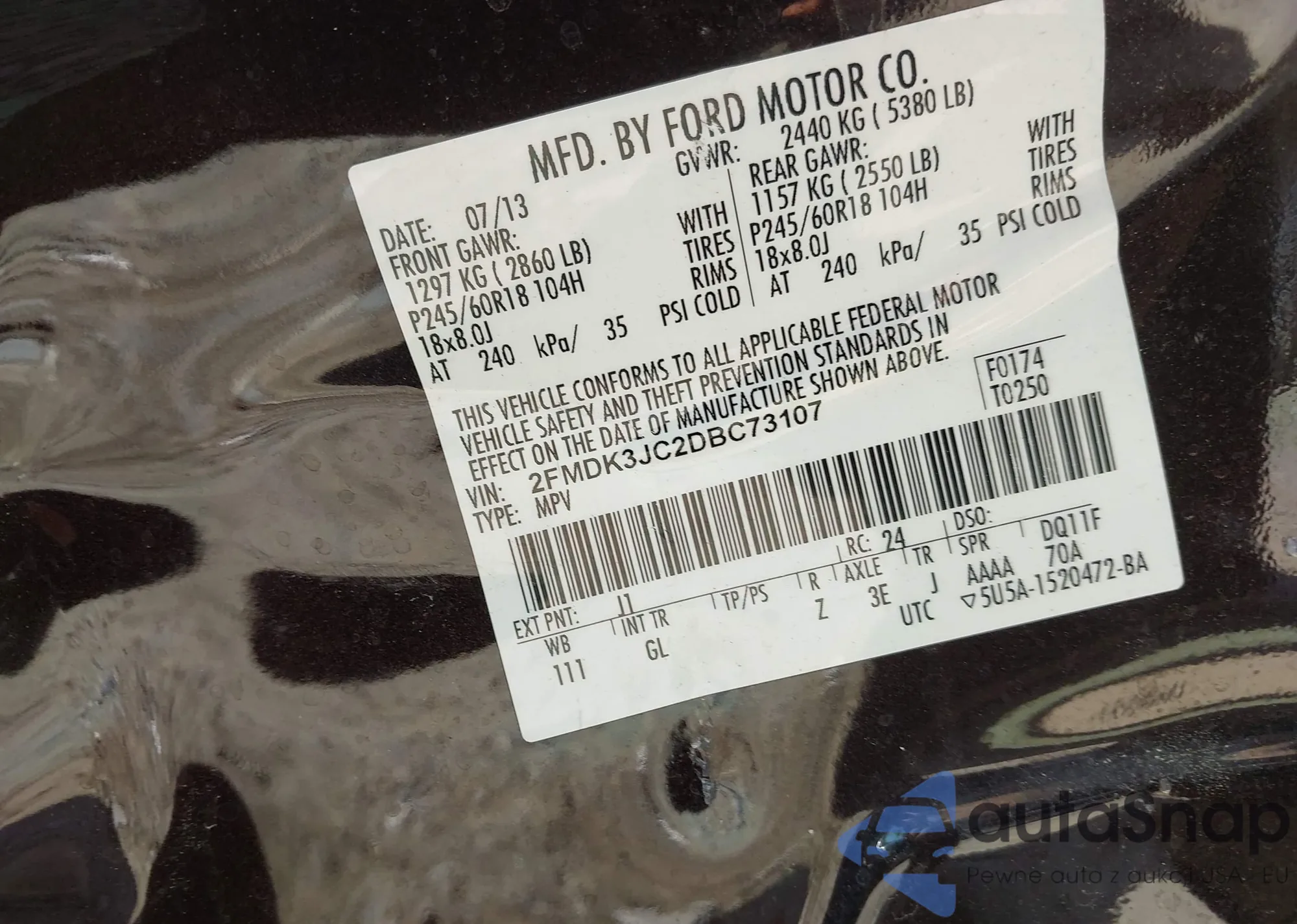 LOT: 42606502 VIN: 2FMDK3JC2DBC73107