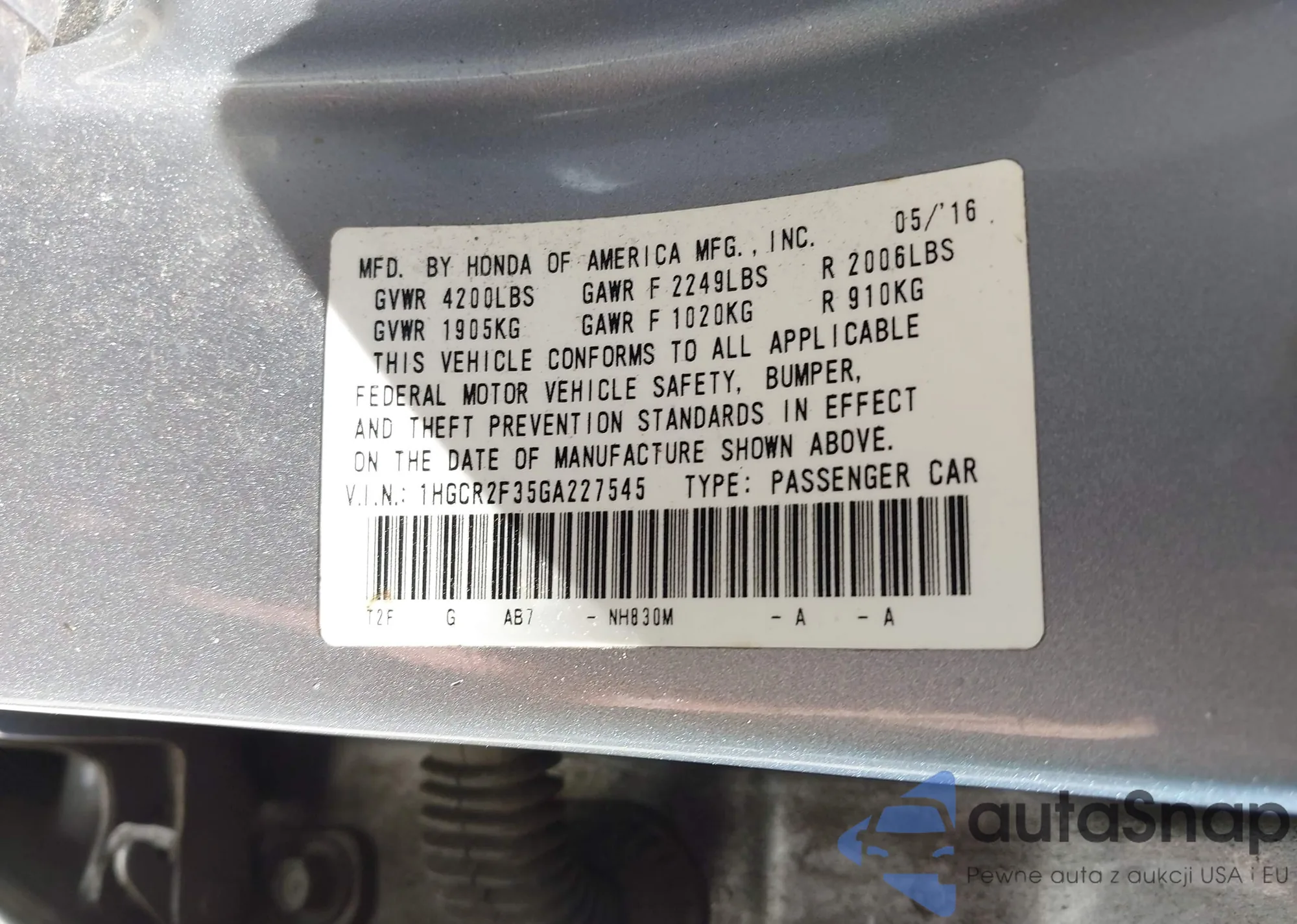 LOT: 43202446 VIN: 1HGCR2F35GA227545