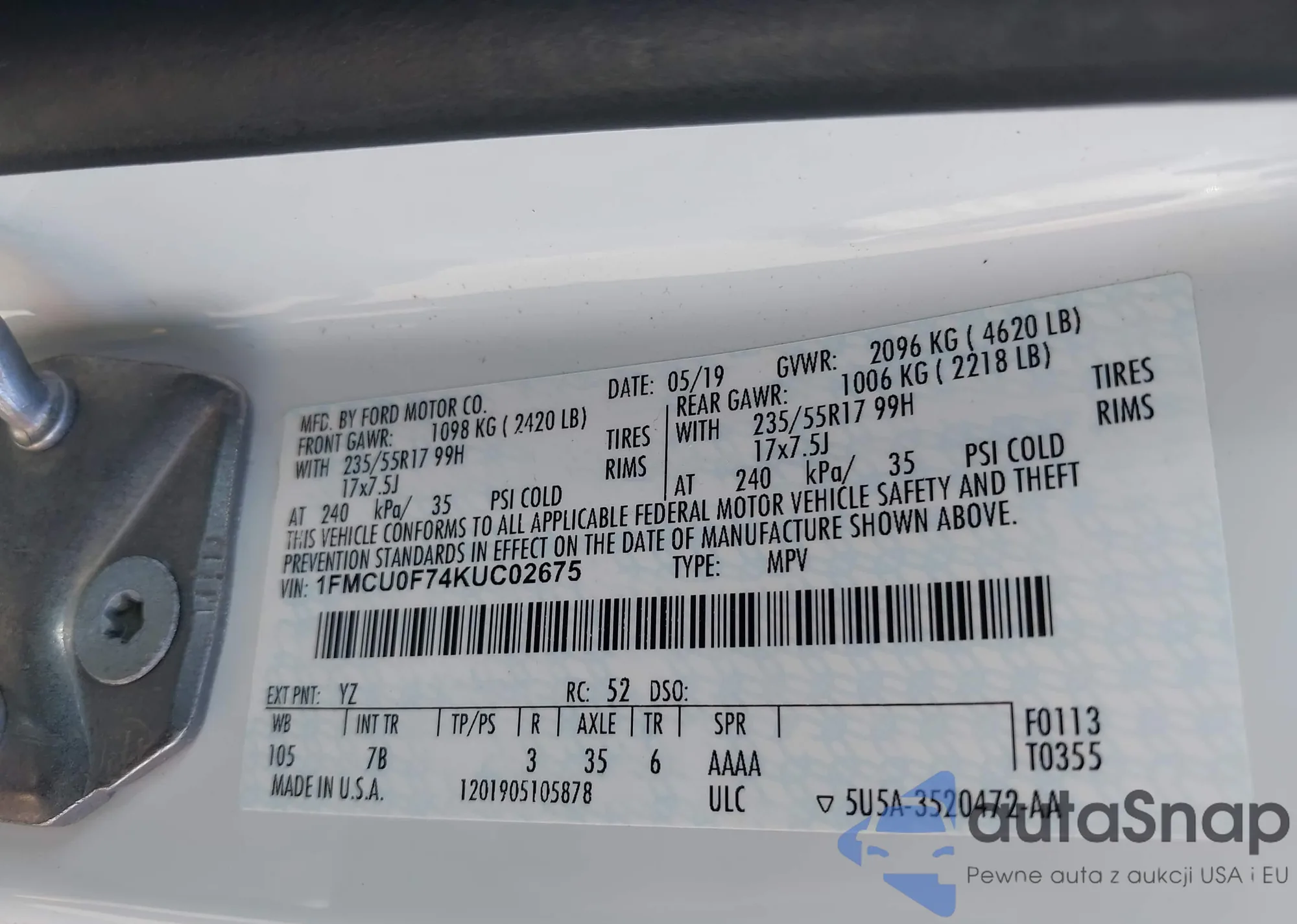 LOT: 43241585 VIN: 1FMCU0F74KUC02675