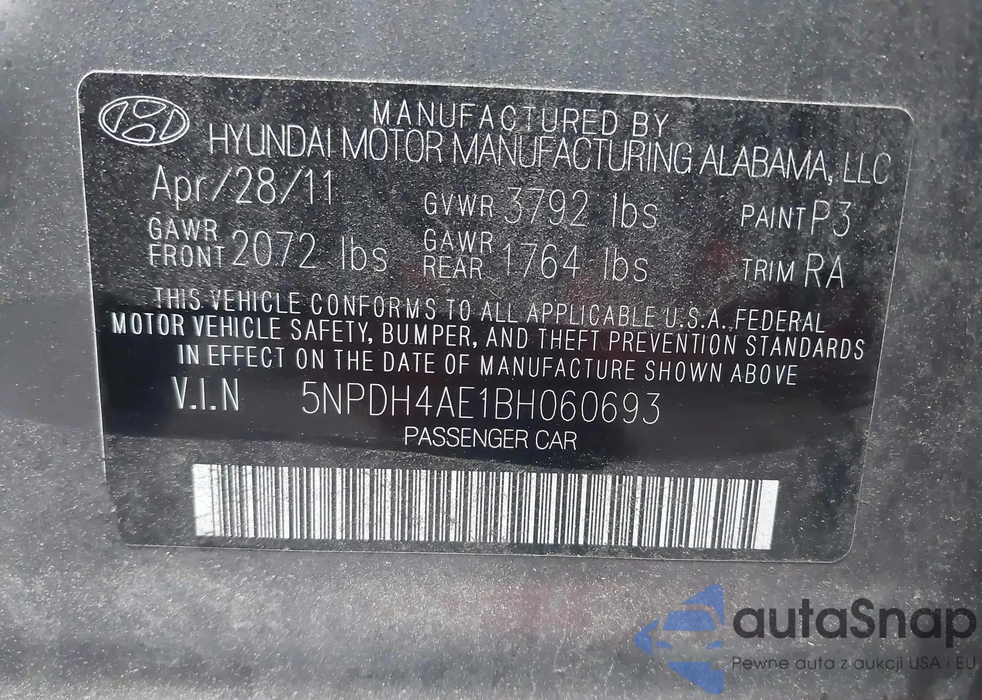 • VIN 5NPDH4AE1BH060693