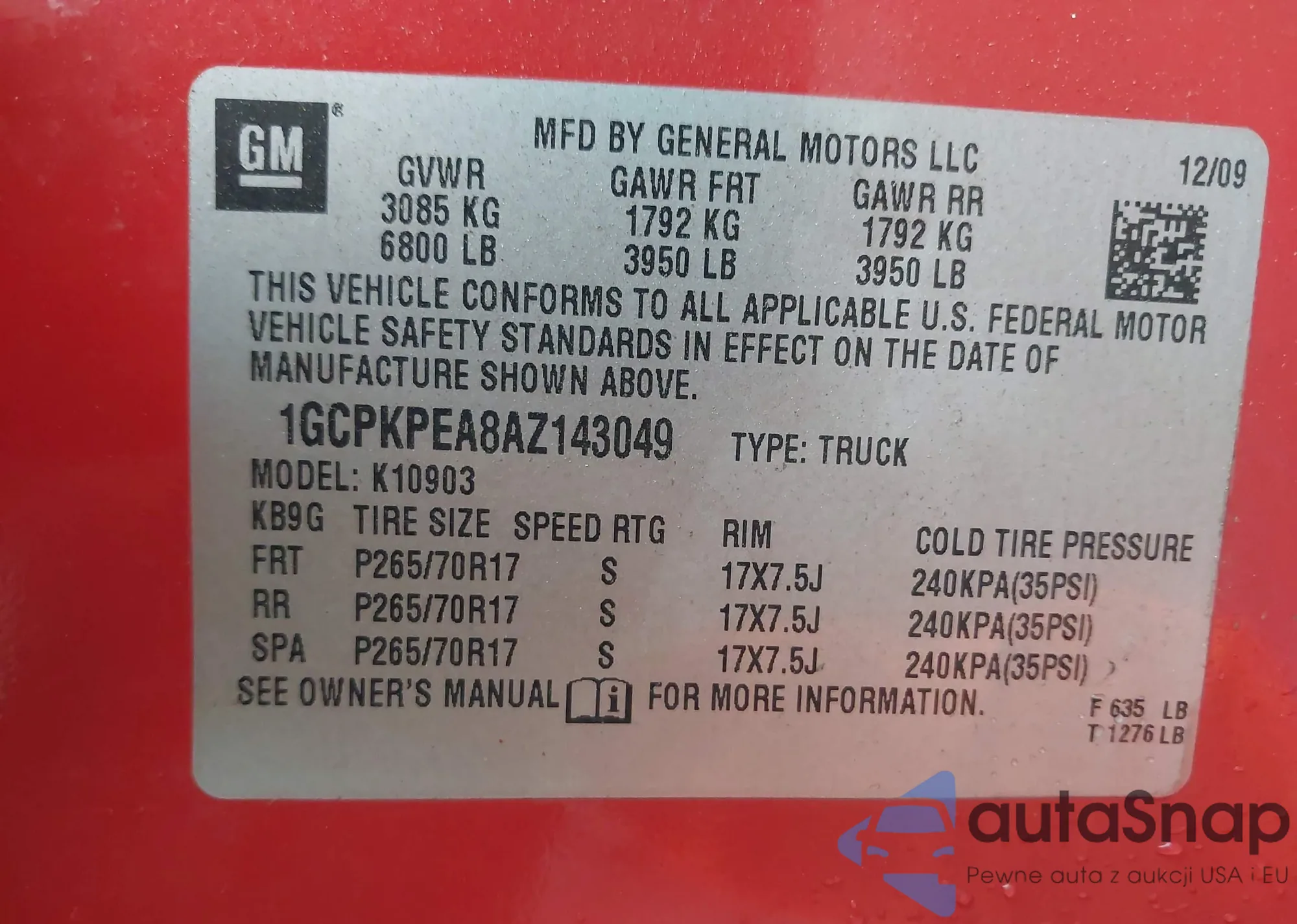 • VIN 1GCPKPEA8AZ143049