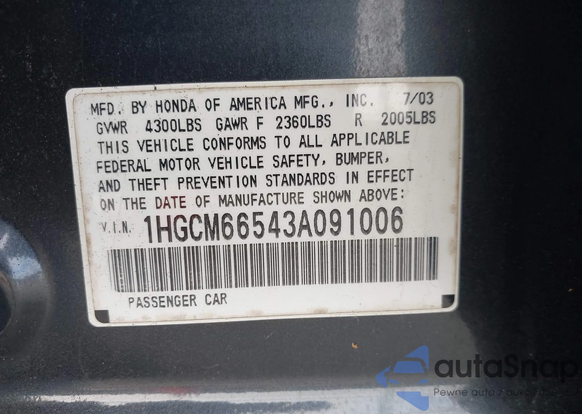 LOT: 43172975 VIN: 1HGCM66543A091006