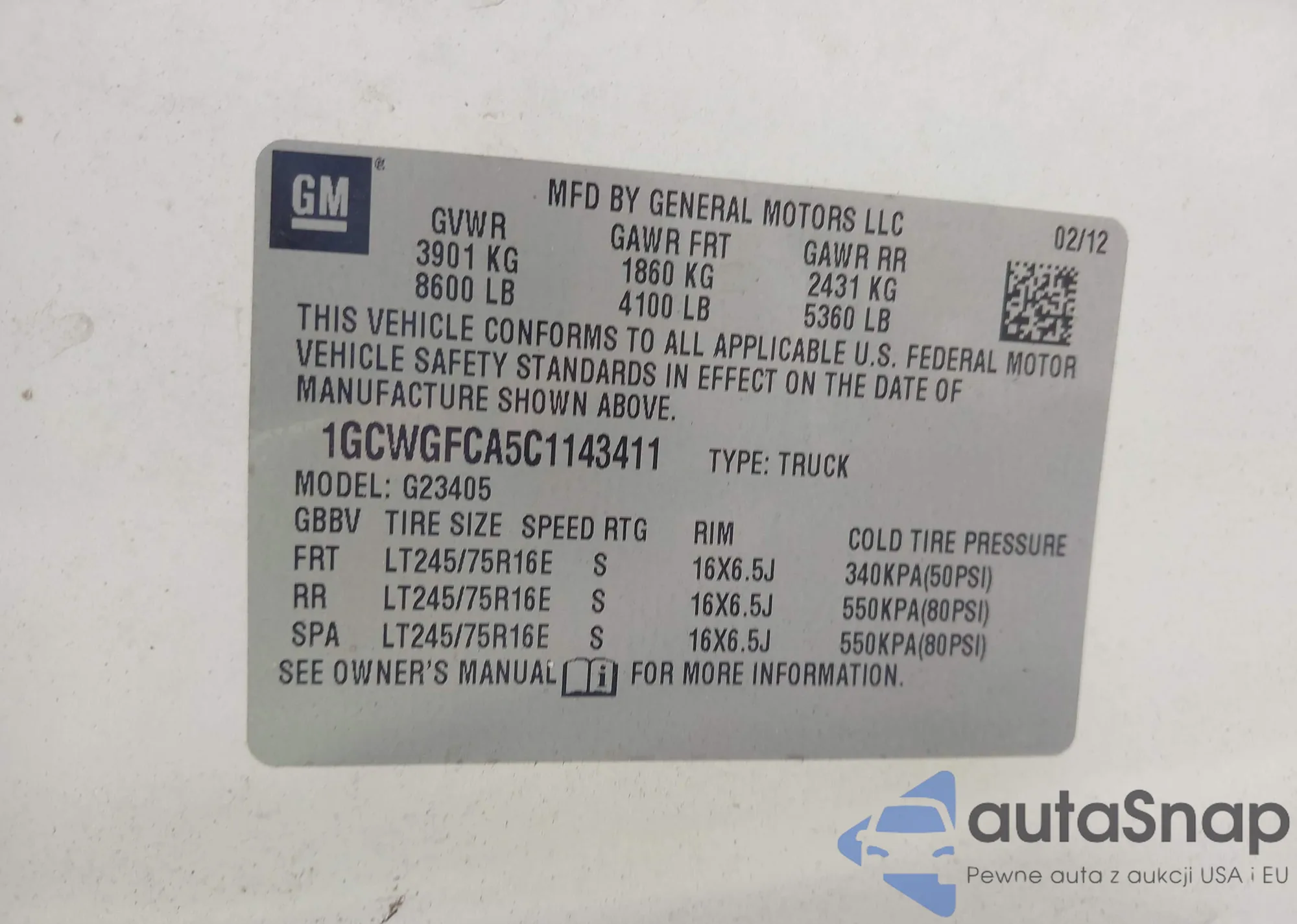 • VIN 1GCWGFCA5C1143411