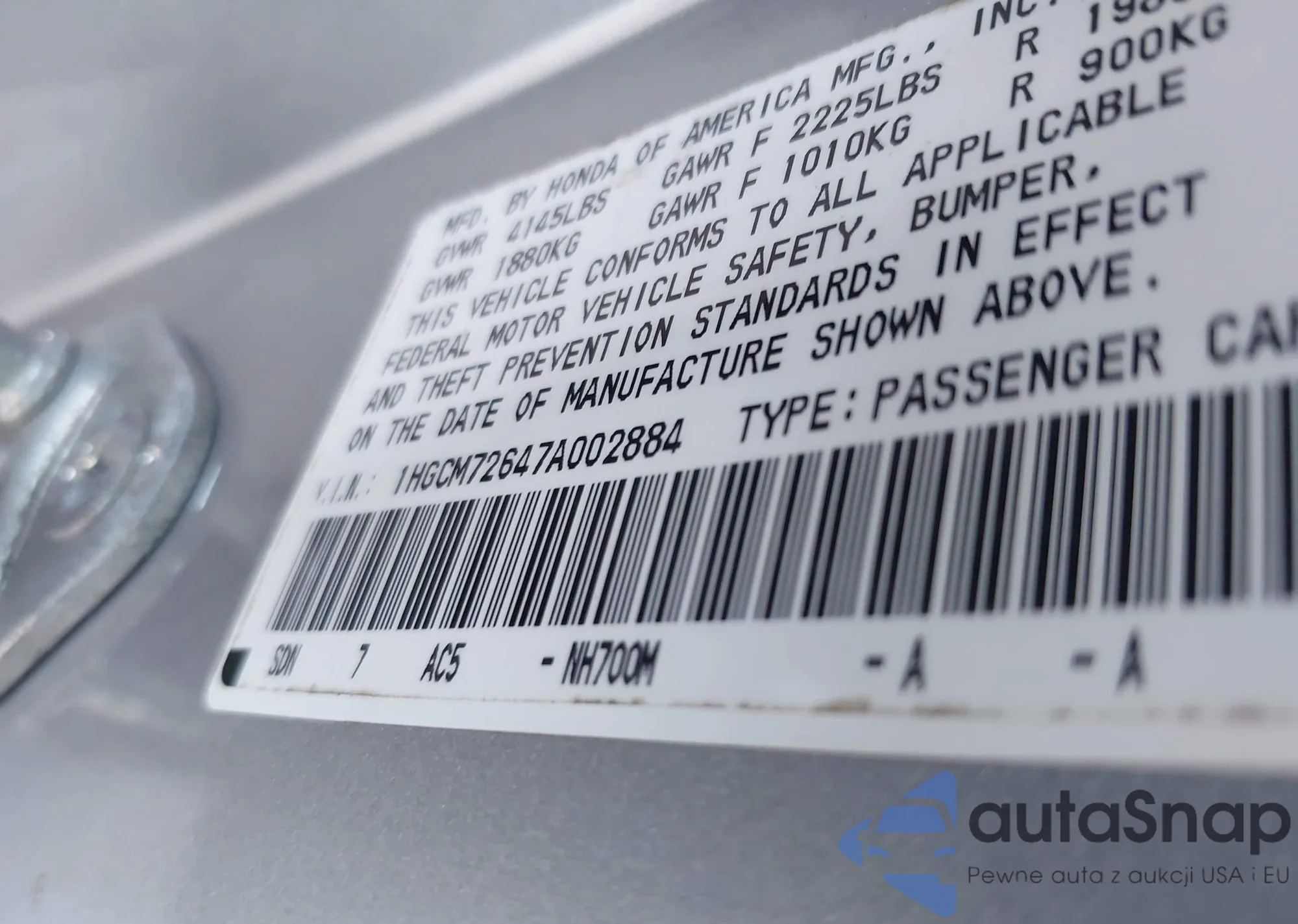 LOT: 43236344 VIN: 1HGCM72647A002884