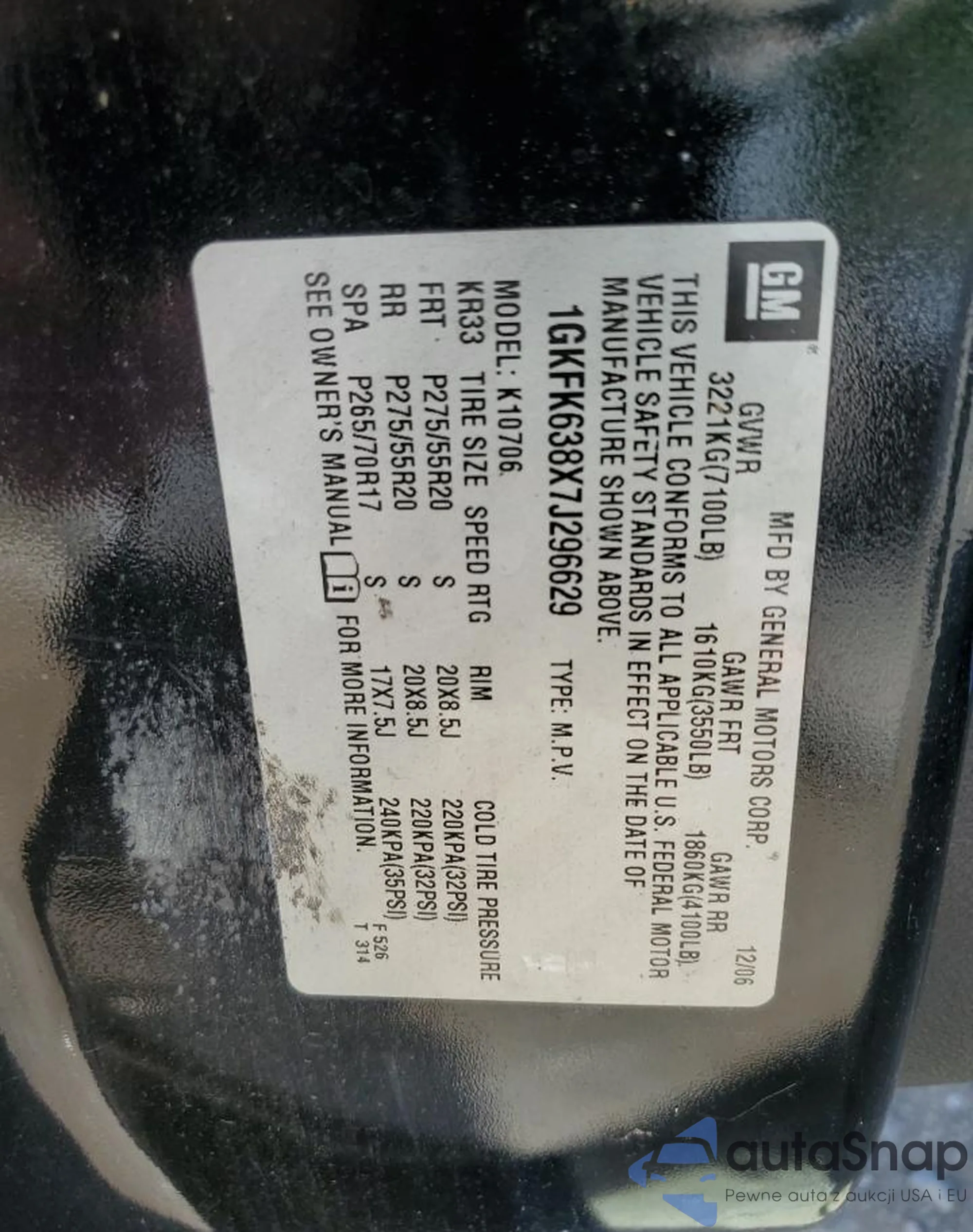 LOT: 70973694 VIN: 1GKFK638X7J296629