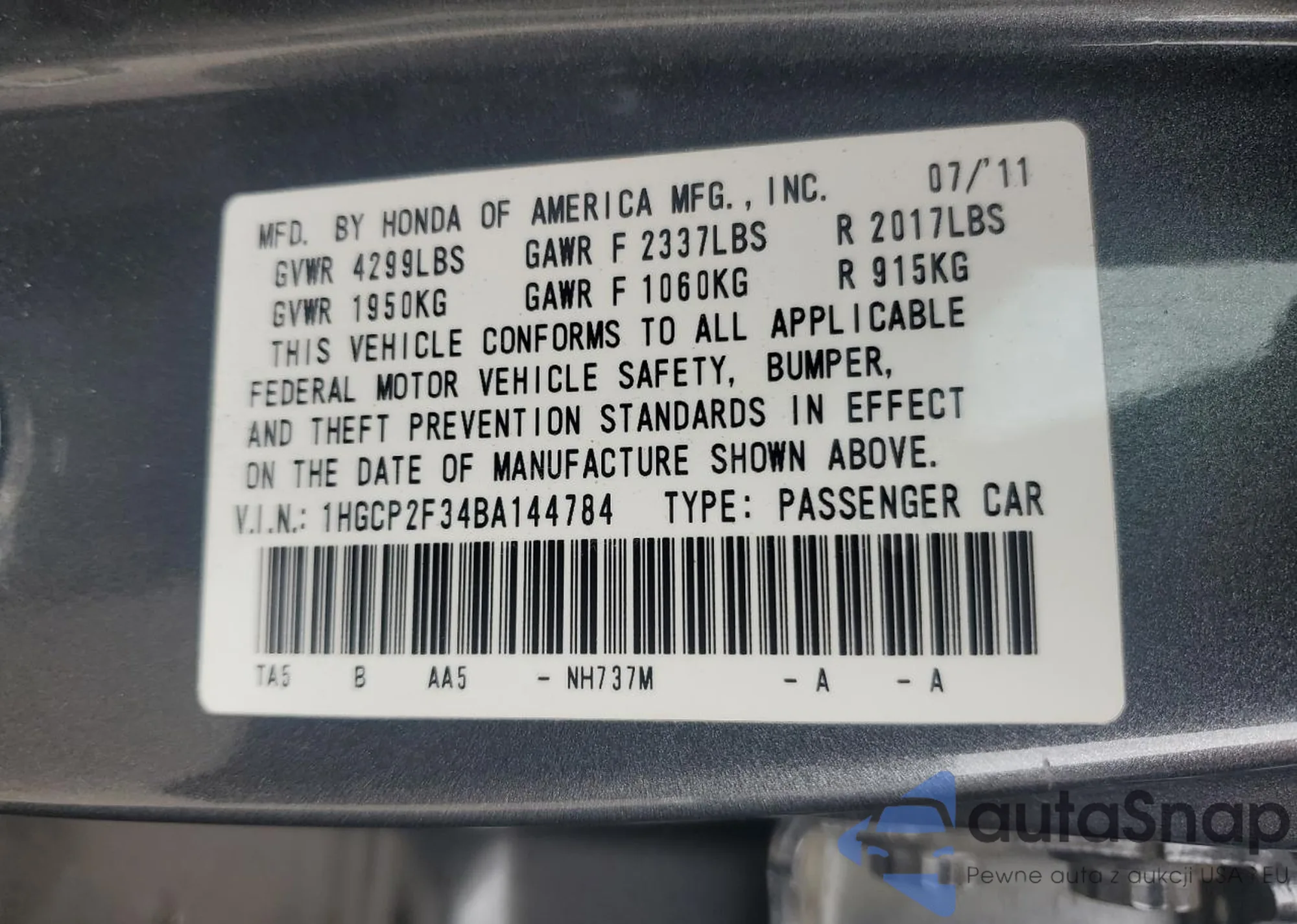 LOT: 68772705 VIN: 1HGCP2F34BA144784