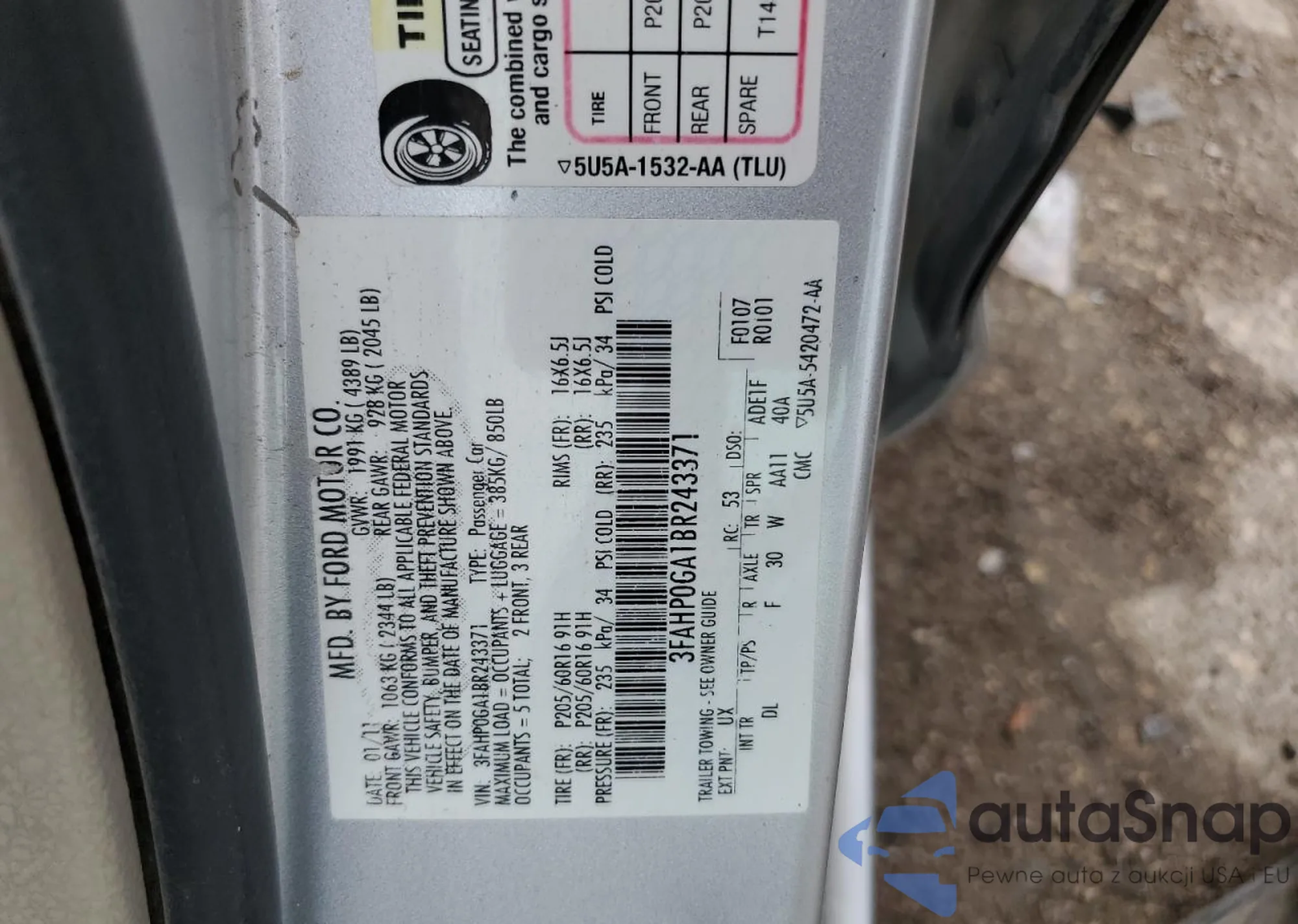 LOT: 65461305 VIN: 3FAHP0GA1BR243371