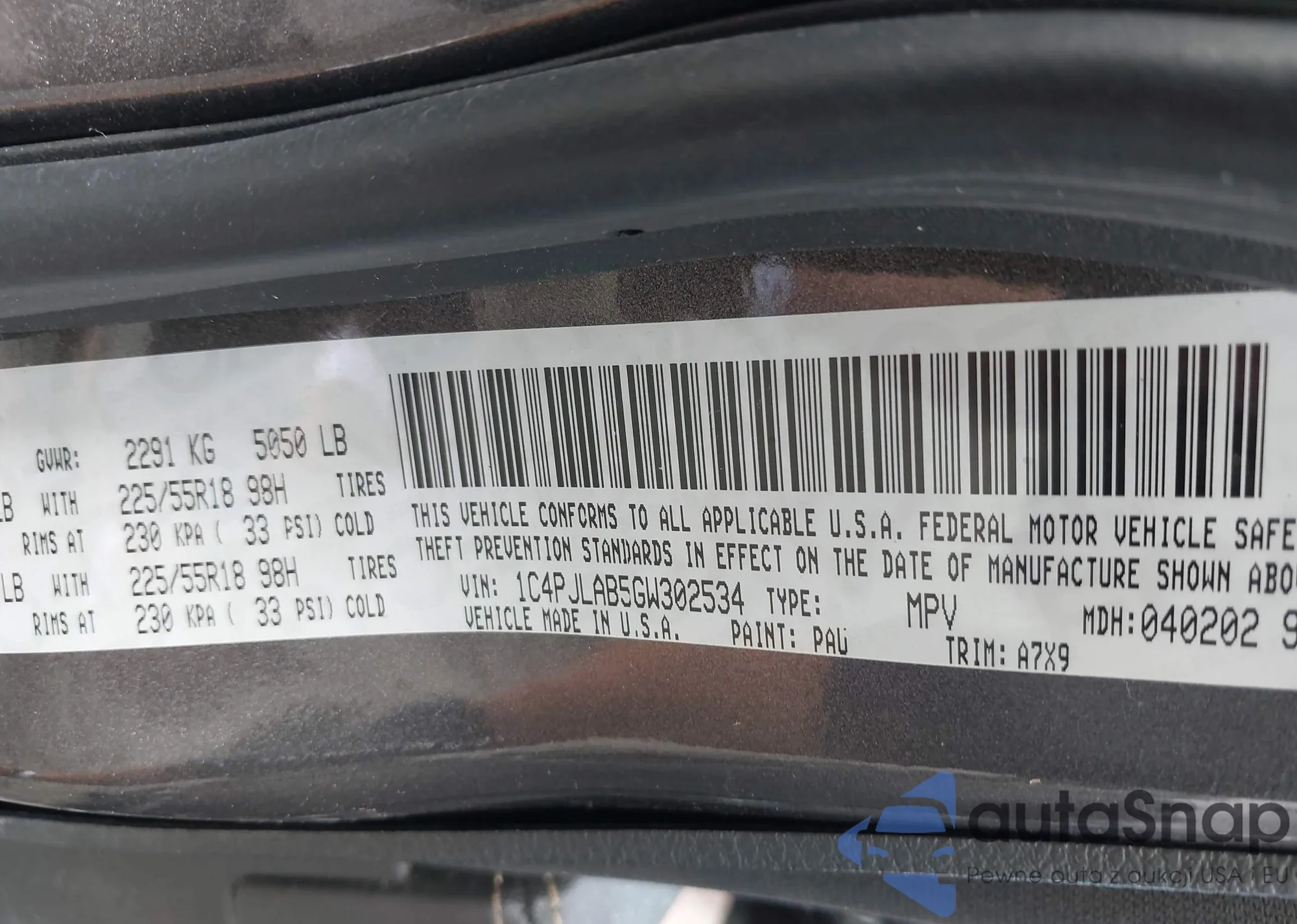 • VIN 1C4PJLAB5GW302634