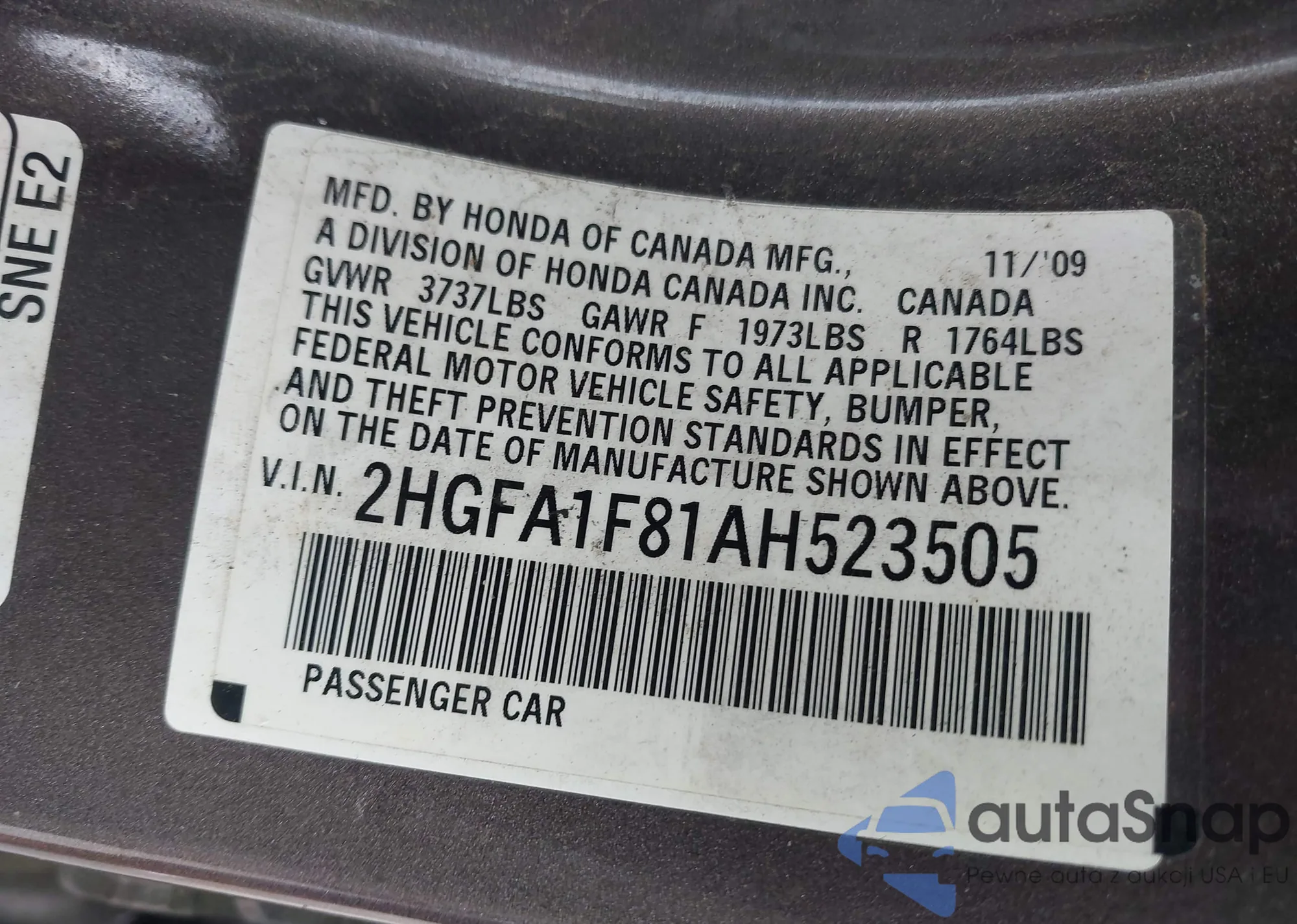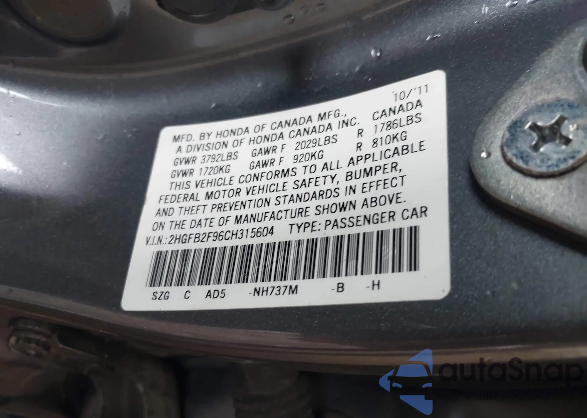 • VIN 2HGFB2F96CH315604